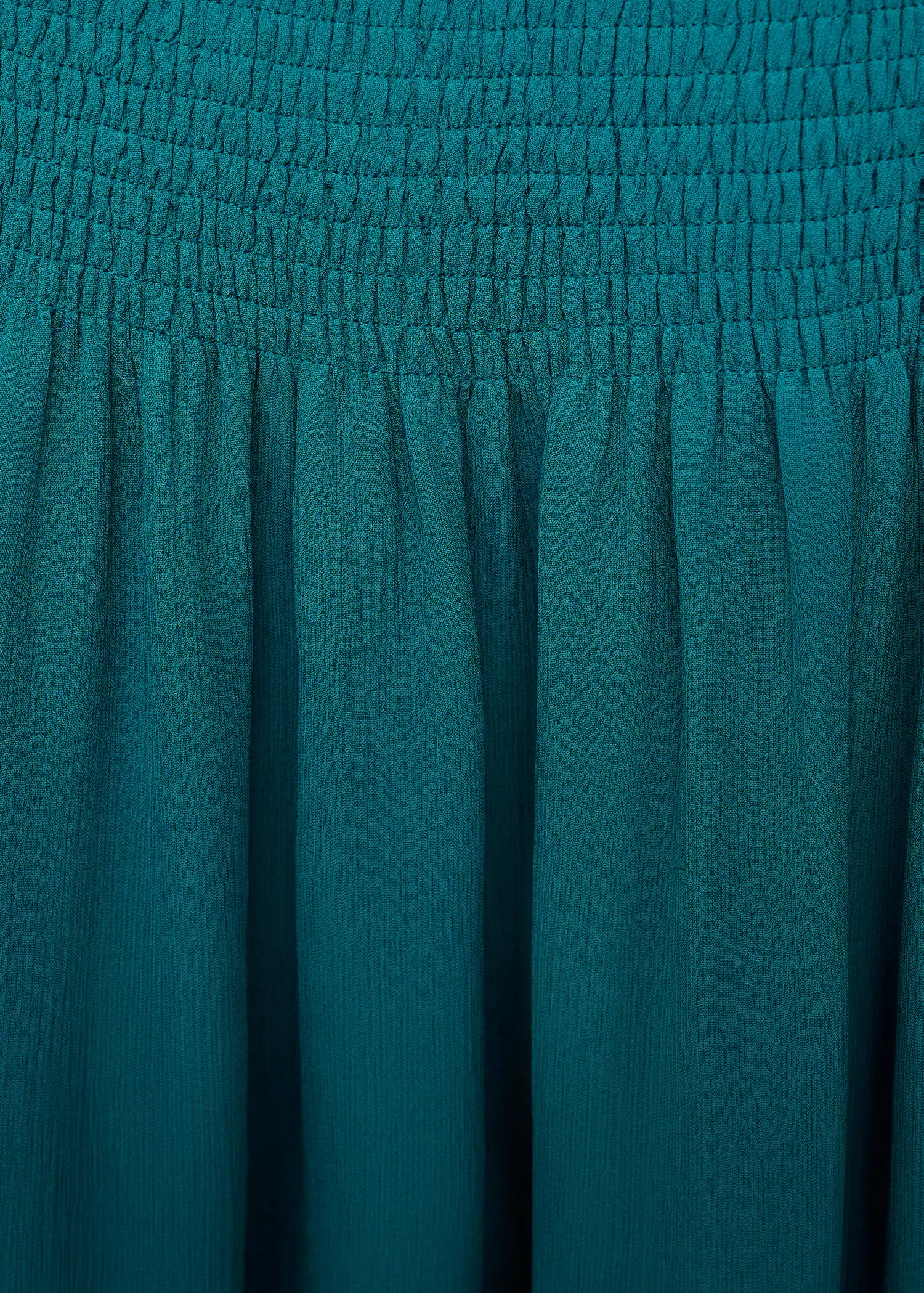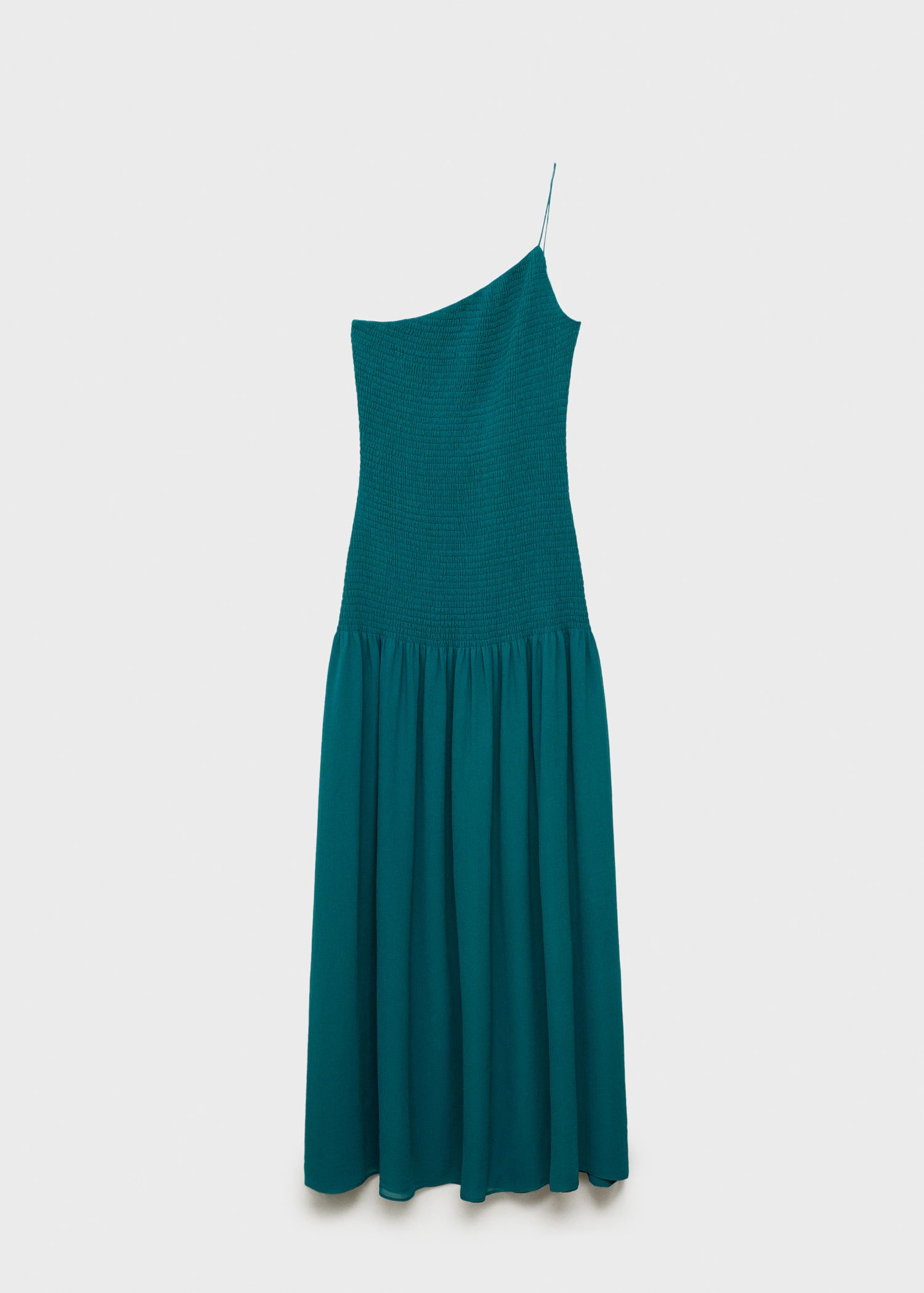 Long design. A-line design. Asymmetric neckline. Ruched body. Sleeveless. Thin strap. Low waist. Inner lining. This garment belongs to our event collection, designed to make you the perfect guest at any party, wedding or ceremony. The blue colour is an online exclusive.