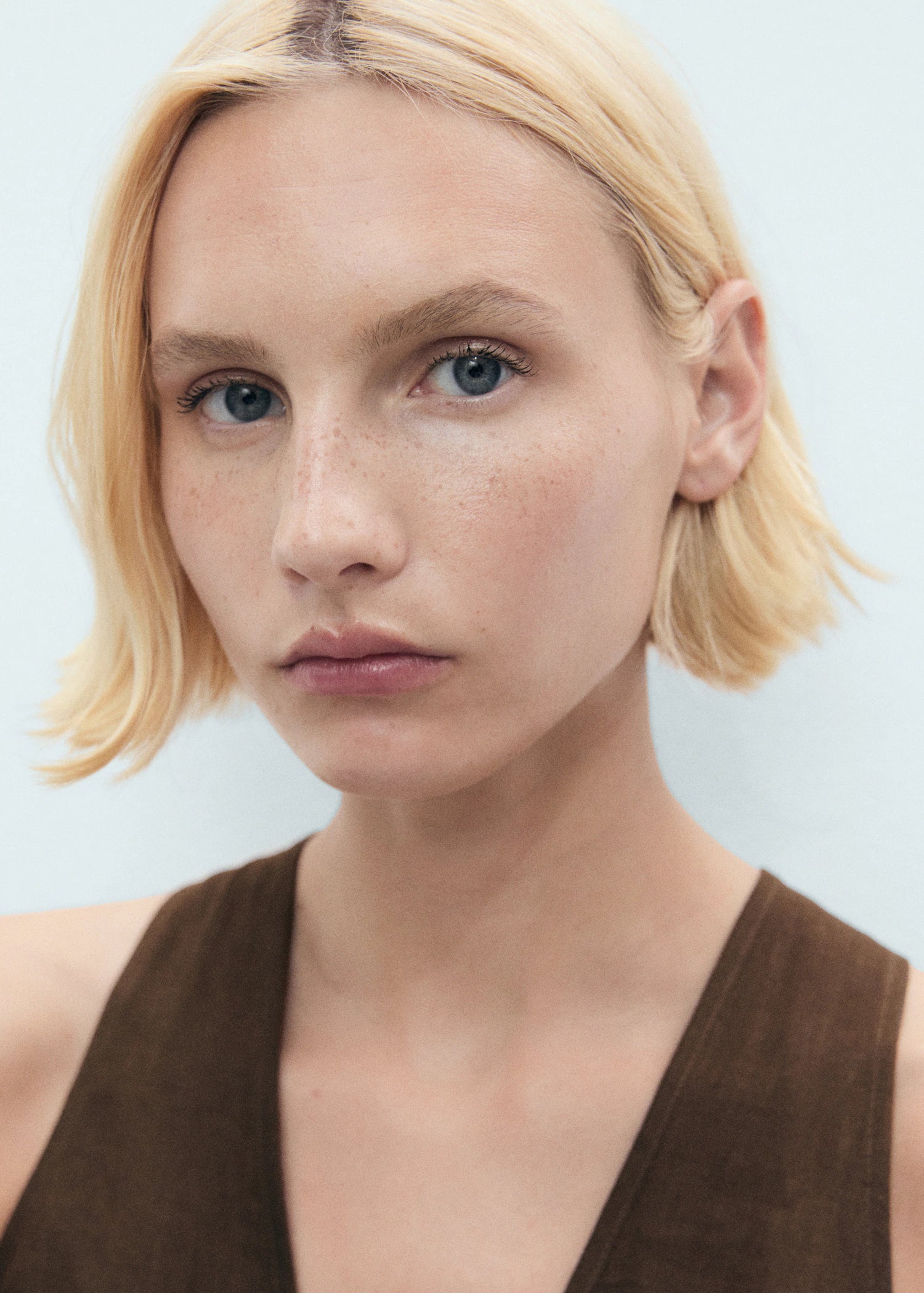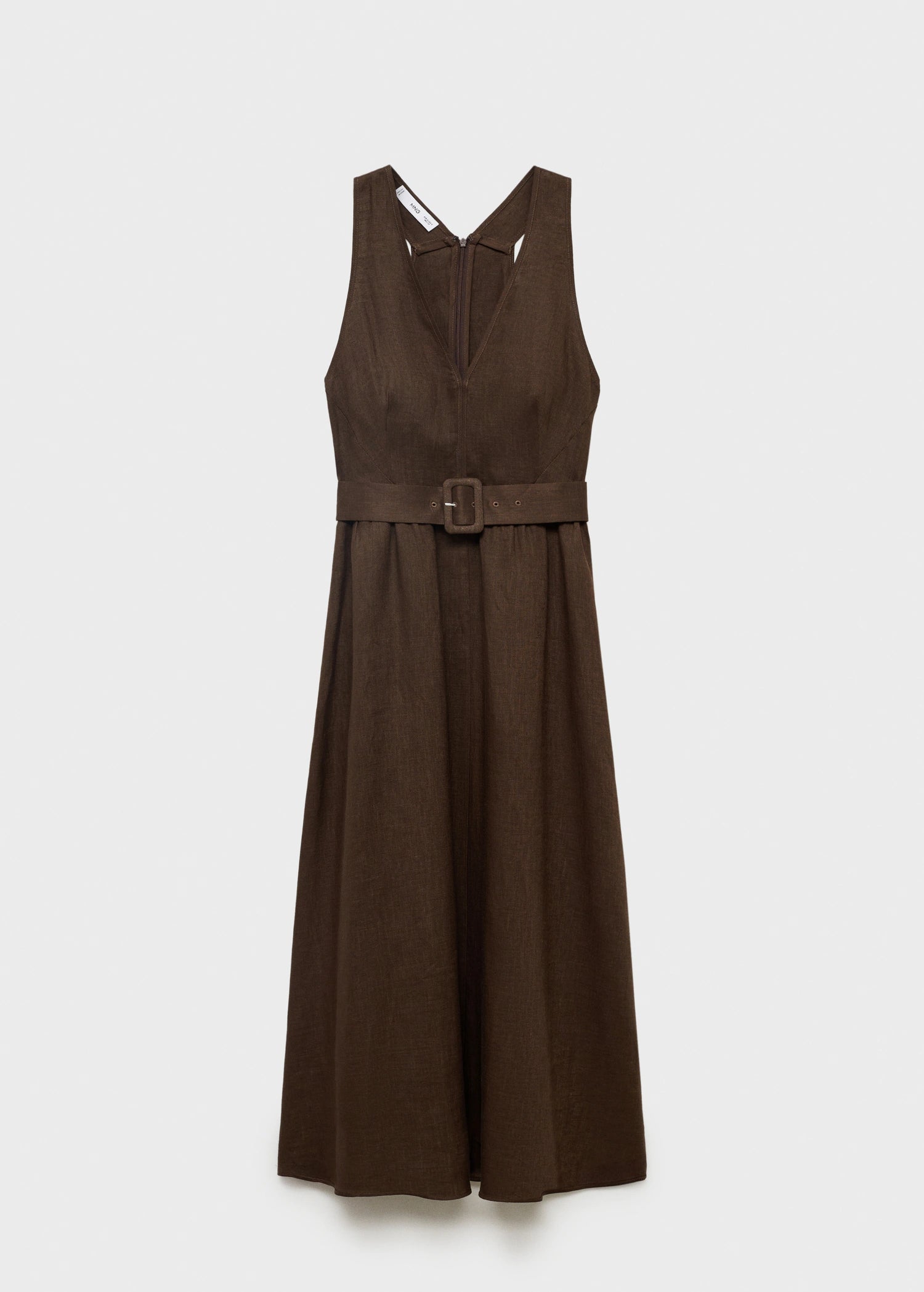 100% linen fabric. Midi design. A-line design. V-neckline. Sleeveless. Wide straps. Removable belt. Zip fastening on the back section. 100% cotton lining.