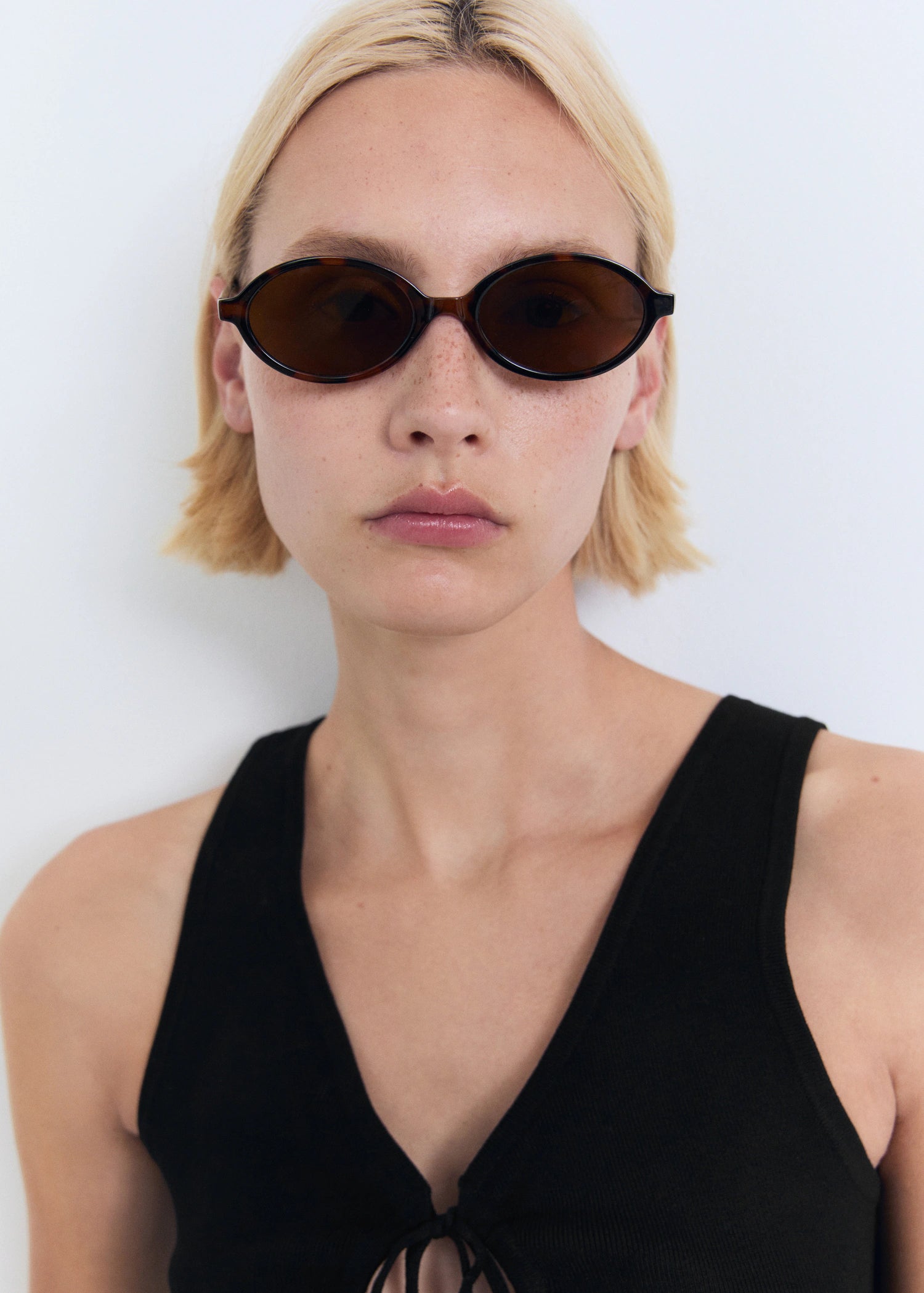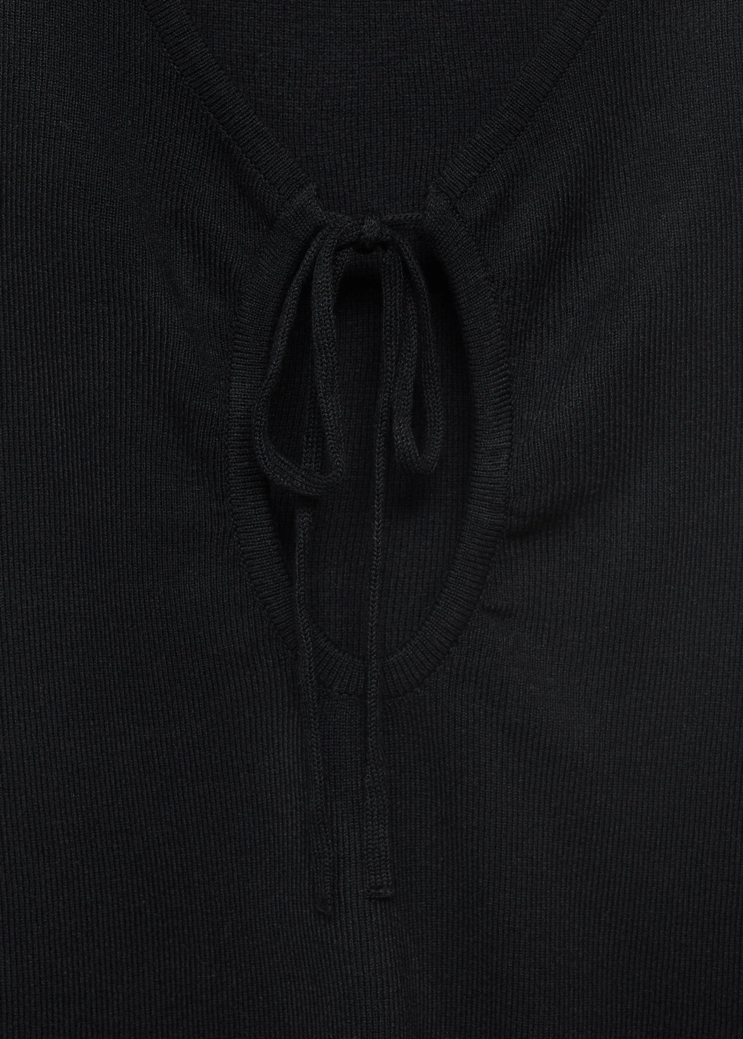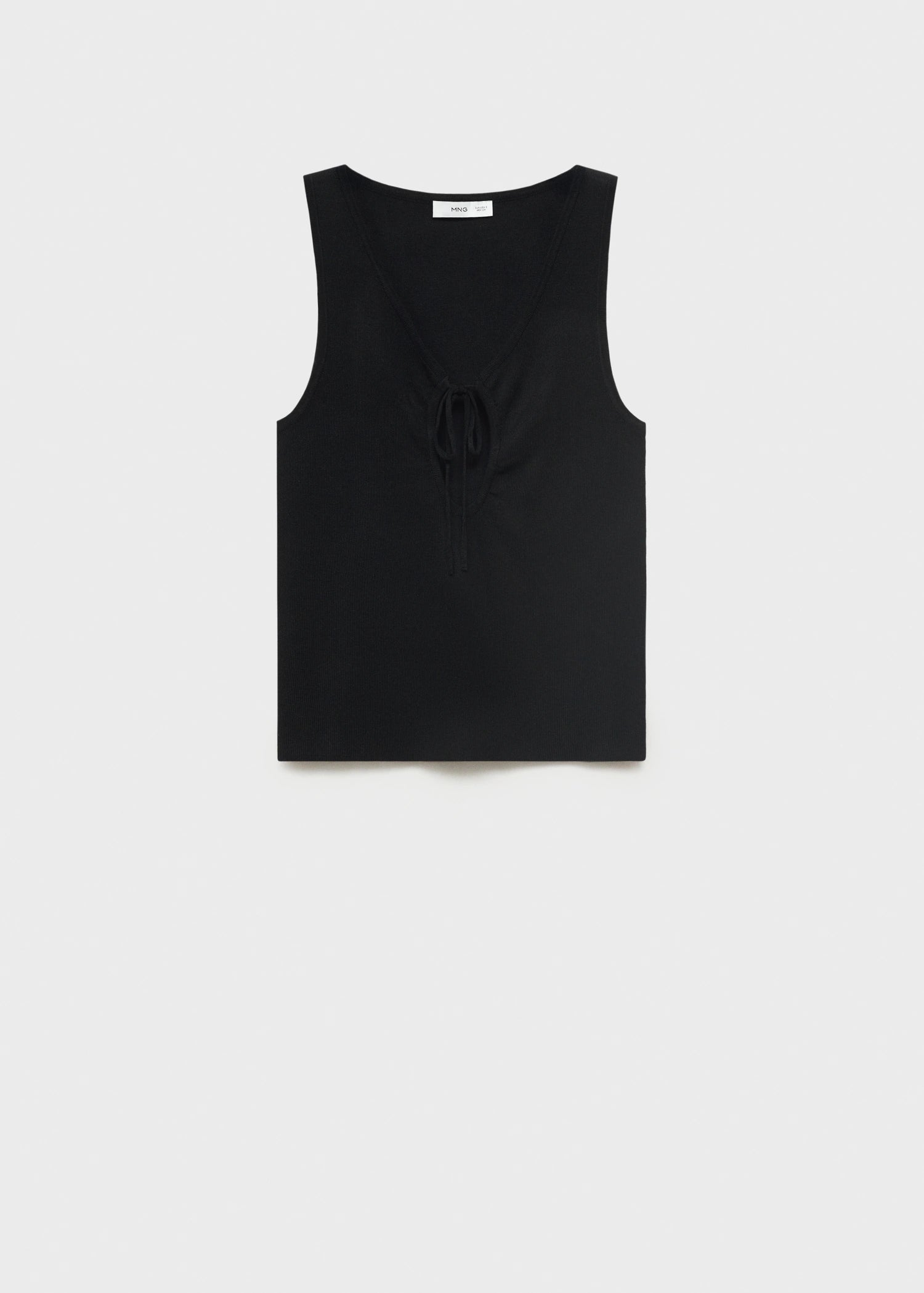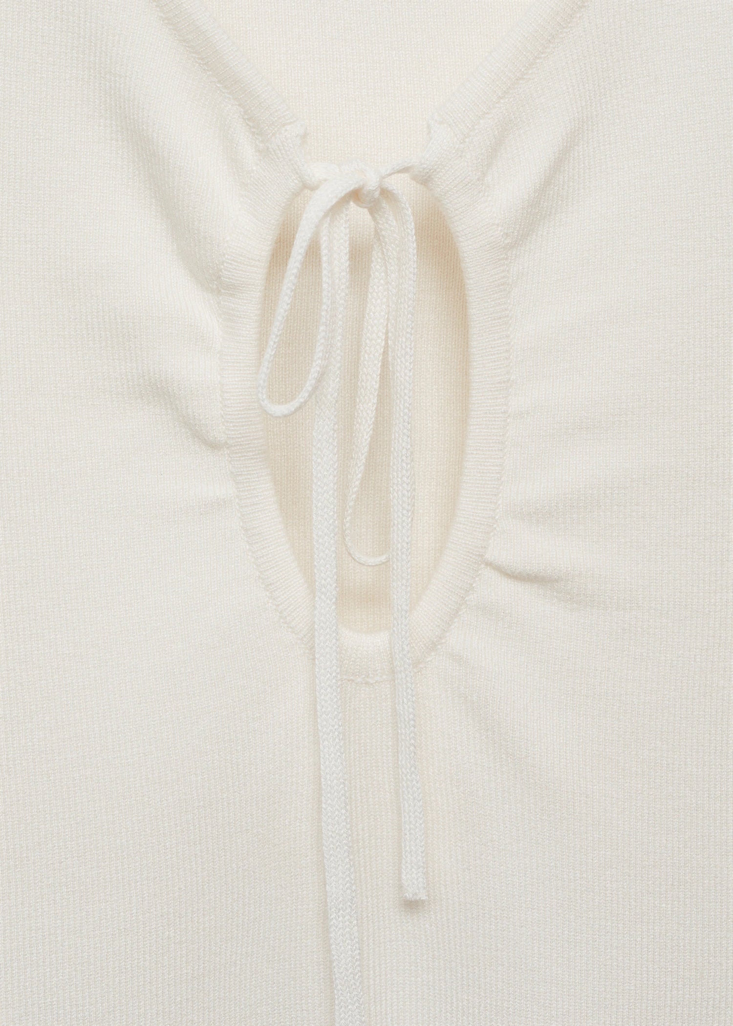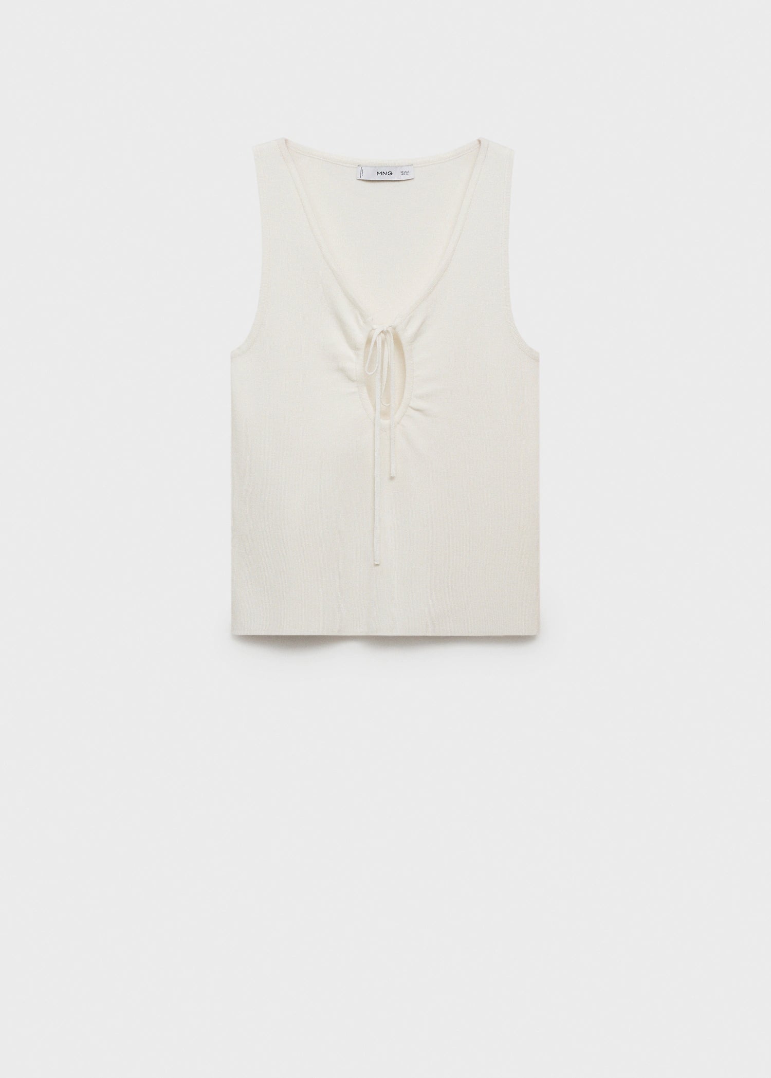This fitted design, crafted from fine-knit fabric, stands out with its elegant V-neck and a delicate bow on the neckline. Featuring wide straps and a sleeveless design, it is characterised by its clean style and absence of fastenings, offering a sophisticated and modern look