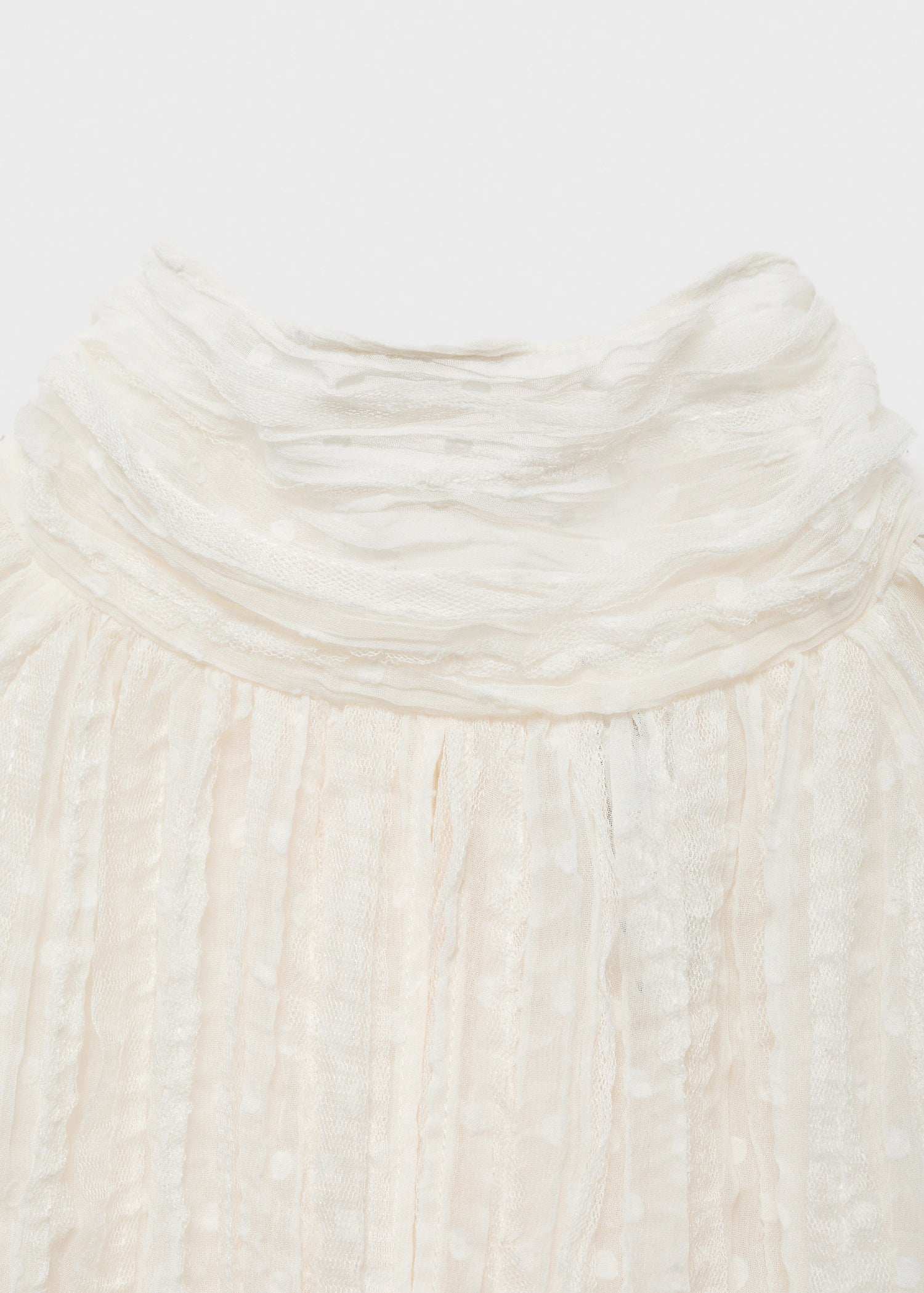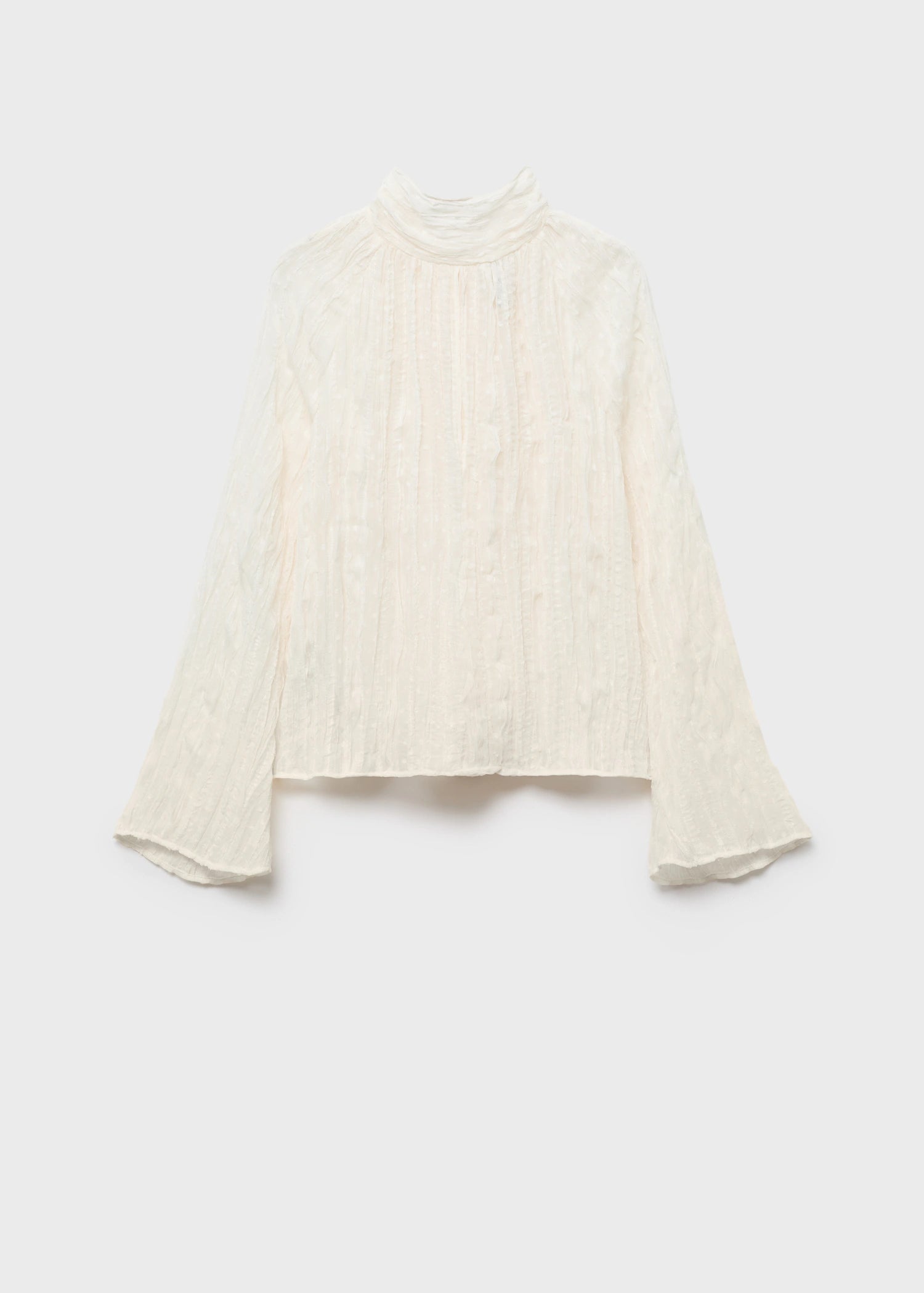 Crafted from textured fabric, this garment features a straight design complemented by a turtleneck adorned with a bow, and long flared sleeves