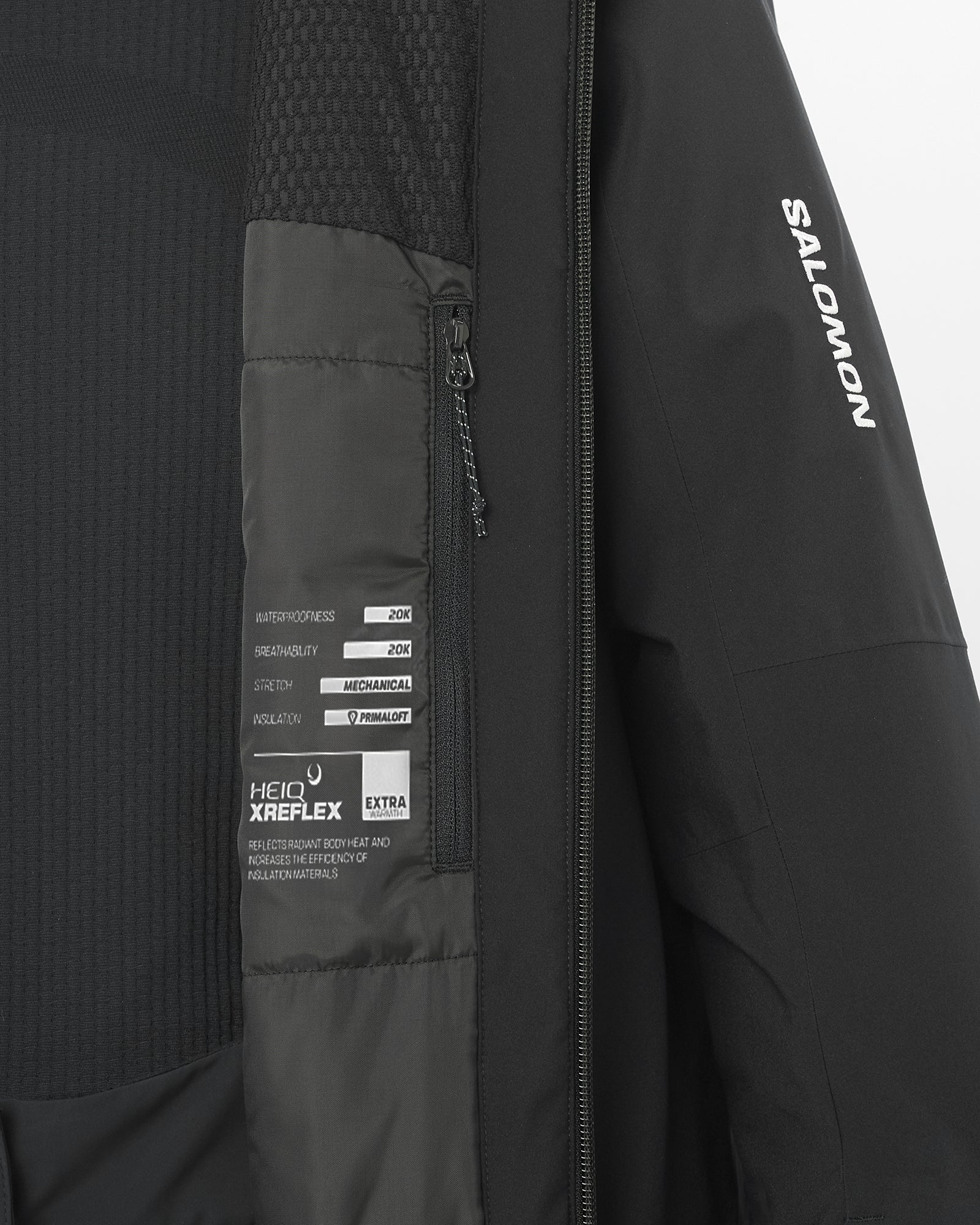 • HeiQ XReflex powered by Xefco: Efficient warmth with less bulk, HeiQ XReflex is a radiant barrier technology that reflects body heat, enhancing insulation while maintaining breathability