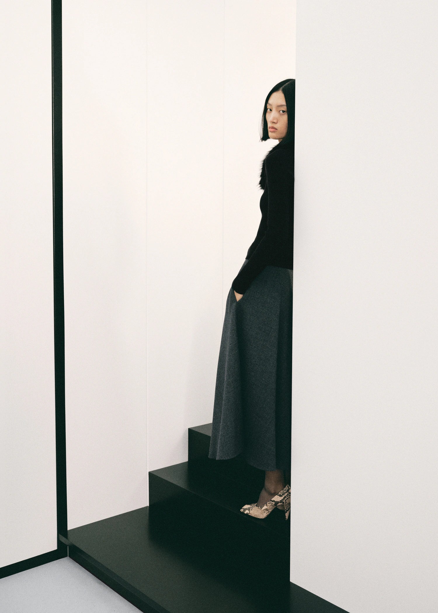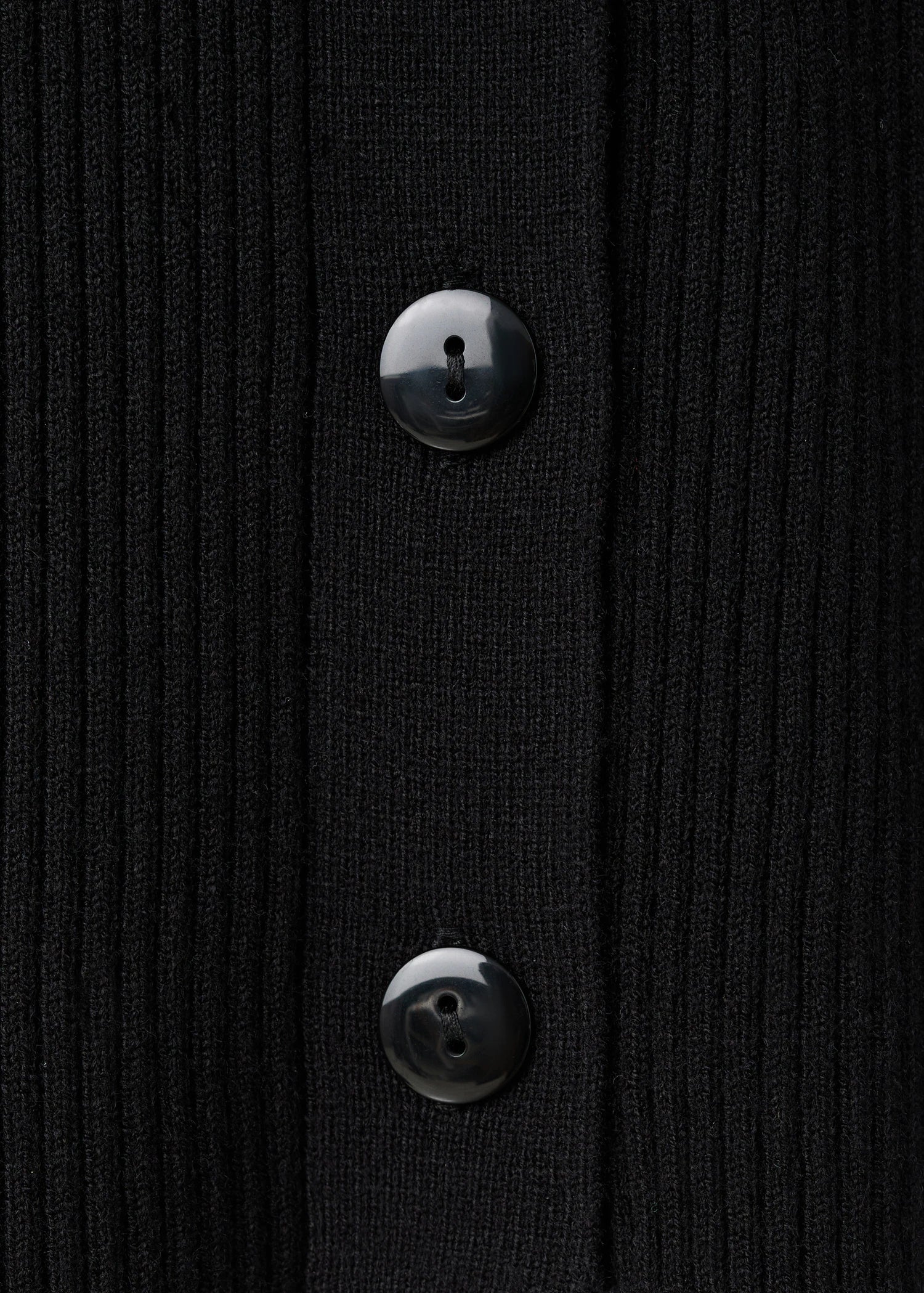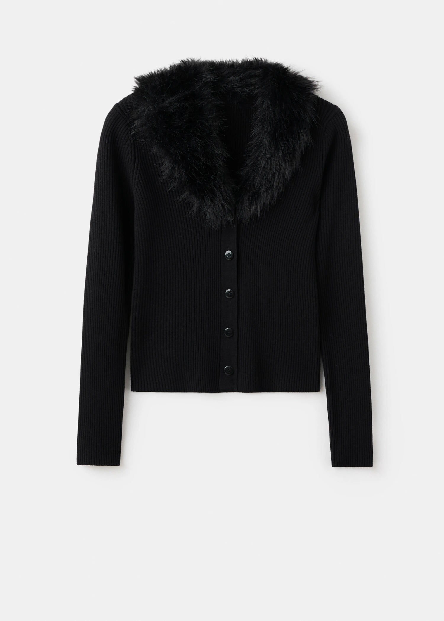 Cable knit fabric. Fitted design. V-neck. Neck with synthetic hair detail. Long sleeves. Front closure with buttons.