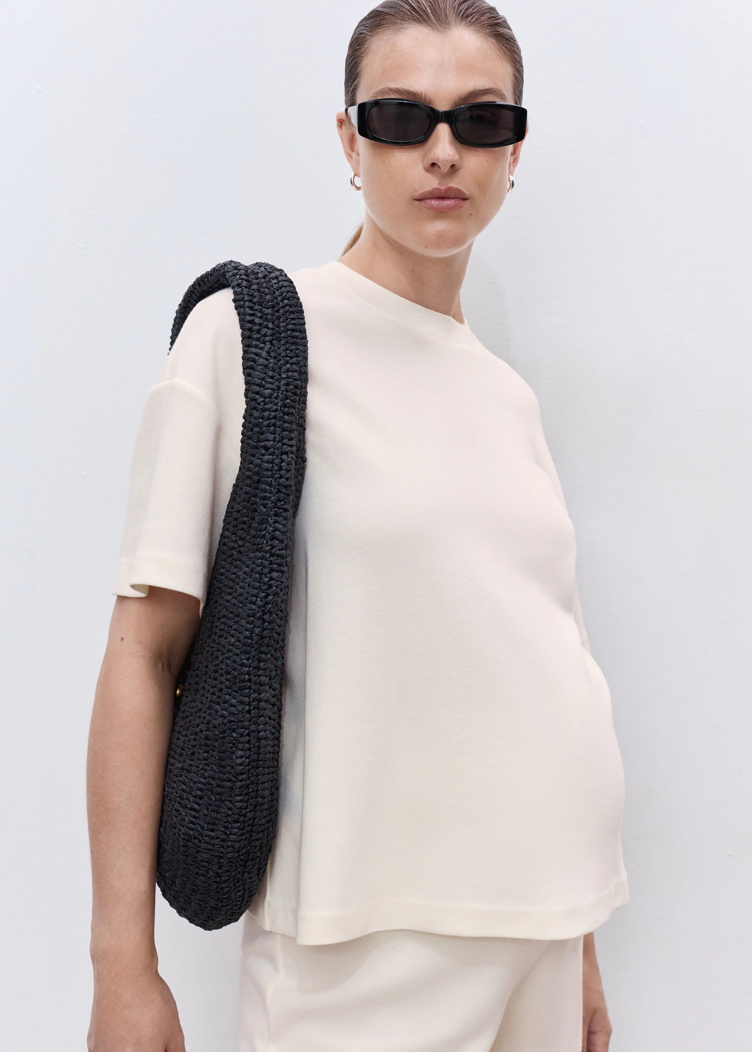 Crafted from a cotton-blend fabric, this maternity garment features a straight design with a round neckline and short sleeves. It is part of an online exclusive total look