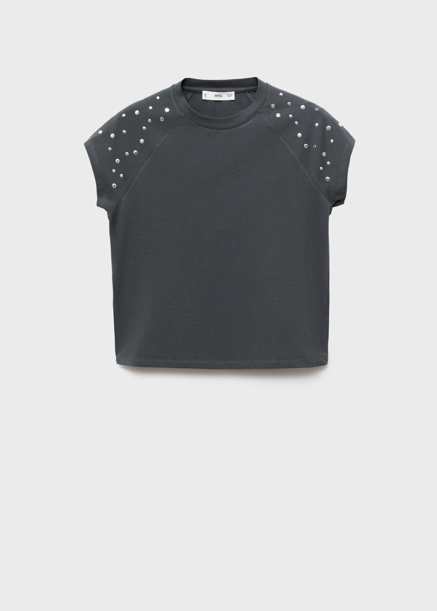 Crafted from cotton fabric, this garment features a straight design with a round neckline and short sleeves. It includes stud detailing on the shoulders, offering an essential piece in your wardrobe with an elevated touch.