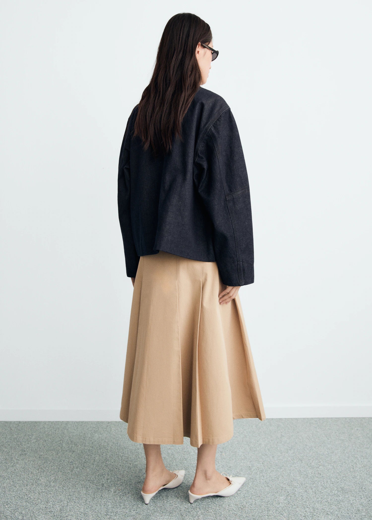 Denim-style cotton fabric. Straight Design. Leather-effect shirt collar. Long sleeves. Patch pocket on the chest. Two patch pockets and front flap pockets. Front closure with buttons. Total look.