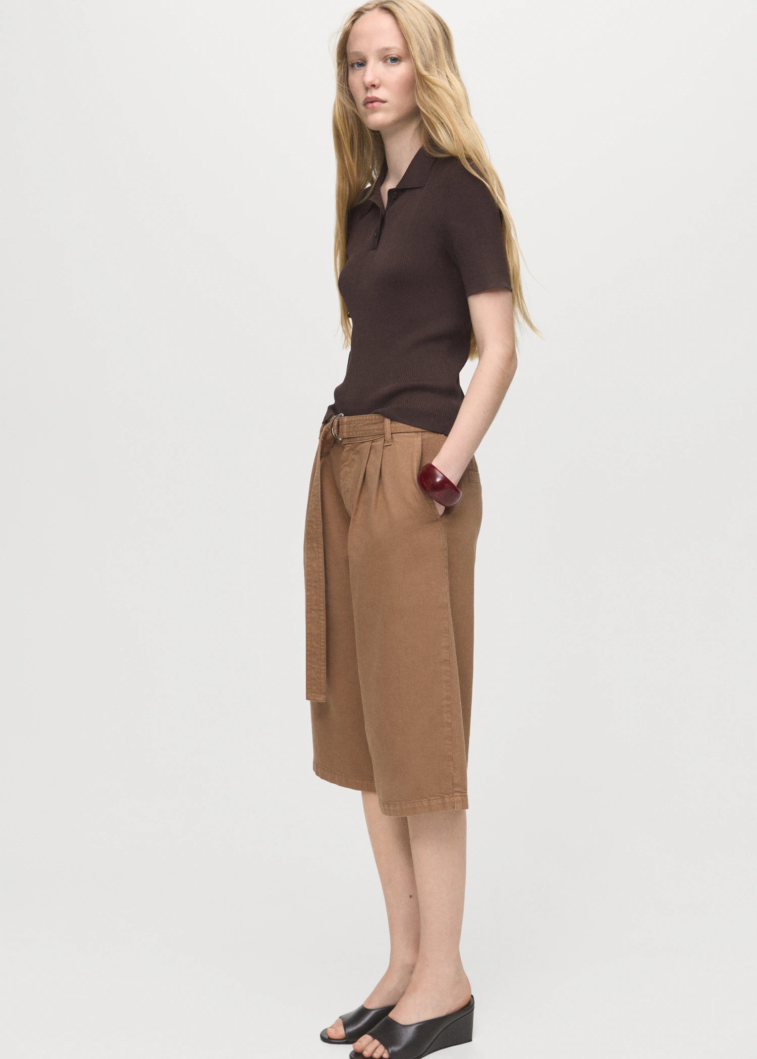 Crafted from denim-style cotton fabric, these bermuda shorts feature a straight design and mid-rise waist. They have two side pockets and two welt pockets at the back. The front pleats and adjustable belt ensure a perfect fit. It comes with a matching waistcoat for a total look