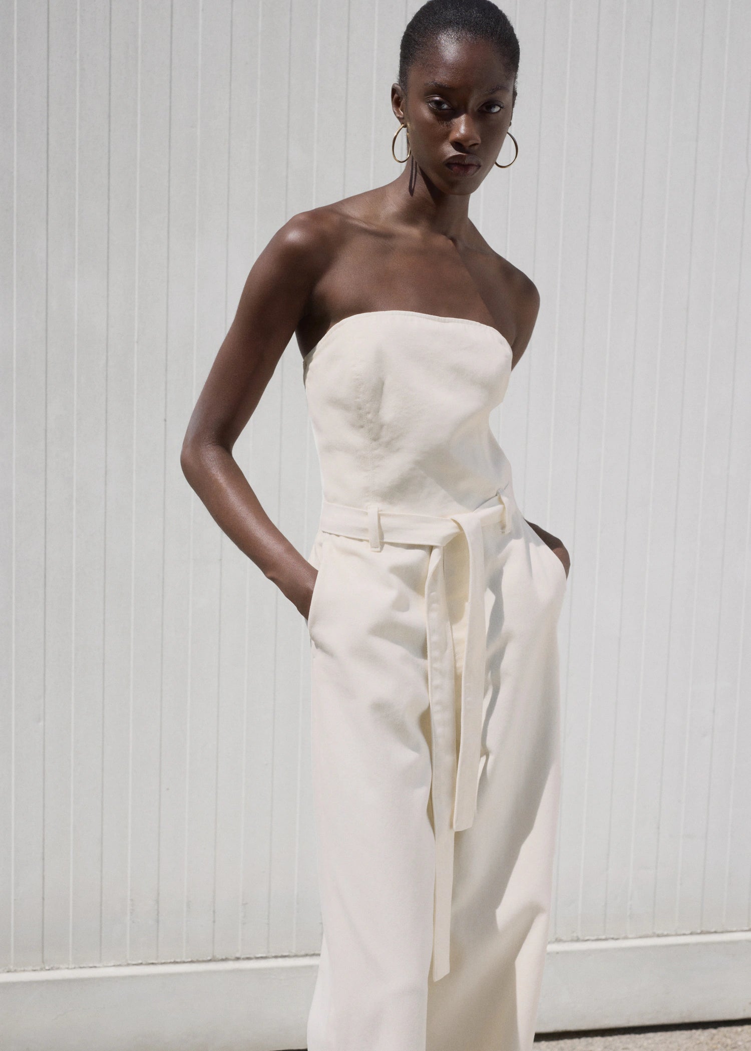 Denim-style cotton fabric. Long design. Straight Design. Low neckline. Sleeveless. Thin straps. Belt loops. Removable belt. Two side pockets with zip closure. This garment is part of our casual collection, designed to stylishly accompany you in your day-to-day life.