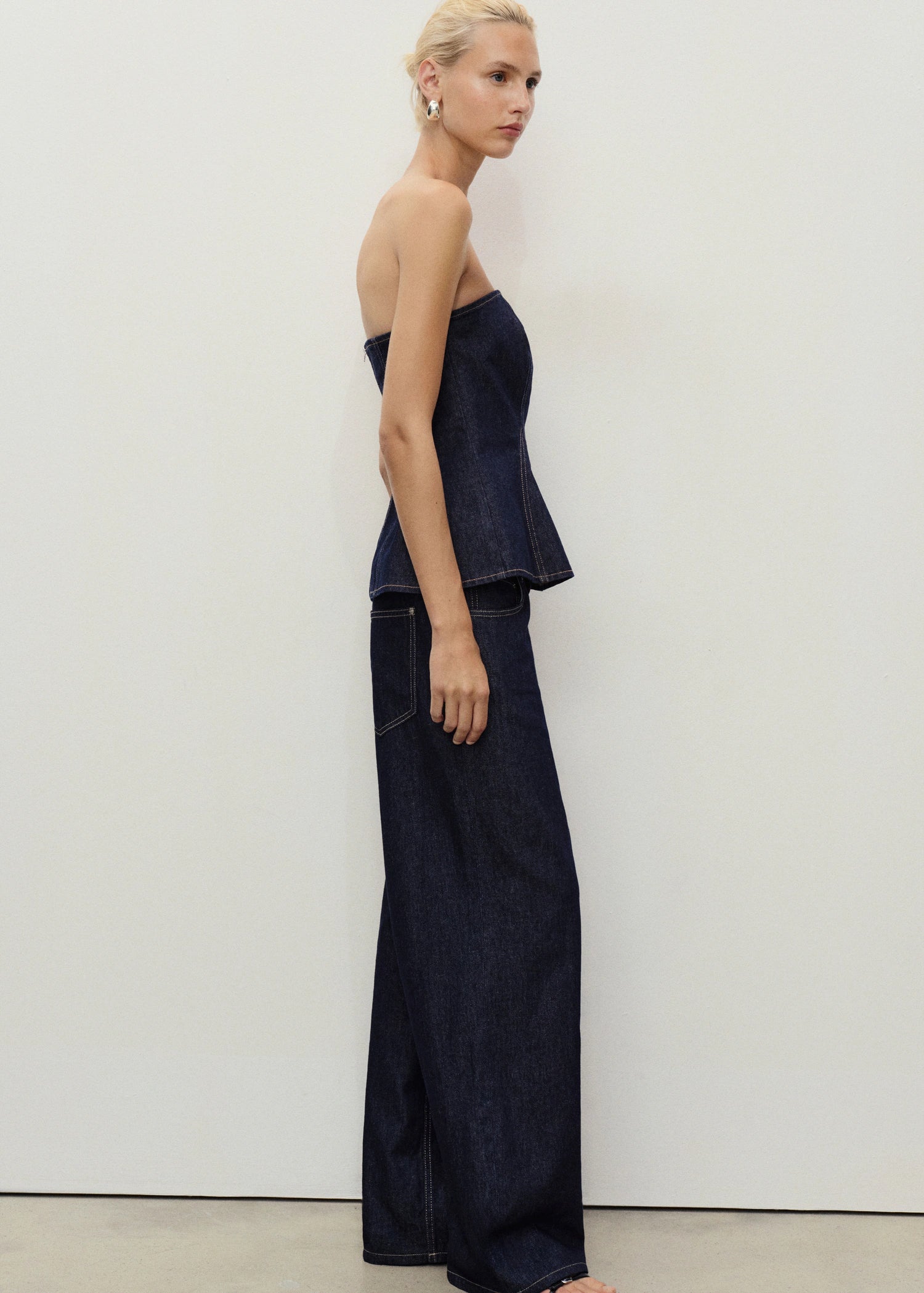 Crafted from cotton denim fabric, this top features a peplum cut and a bandeau design. It is completed with matching jeans, perfect for a total denim look.