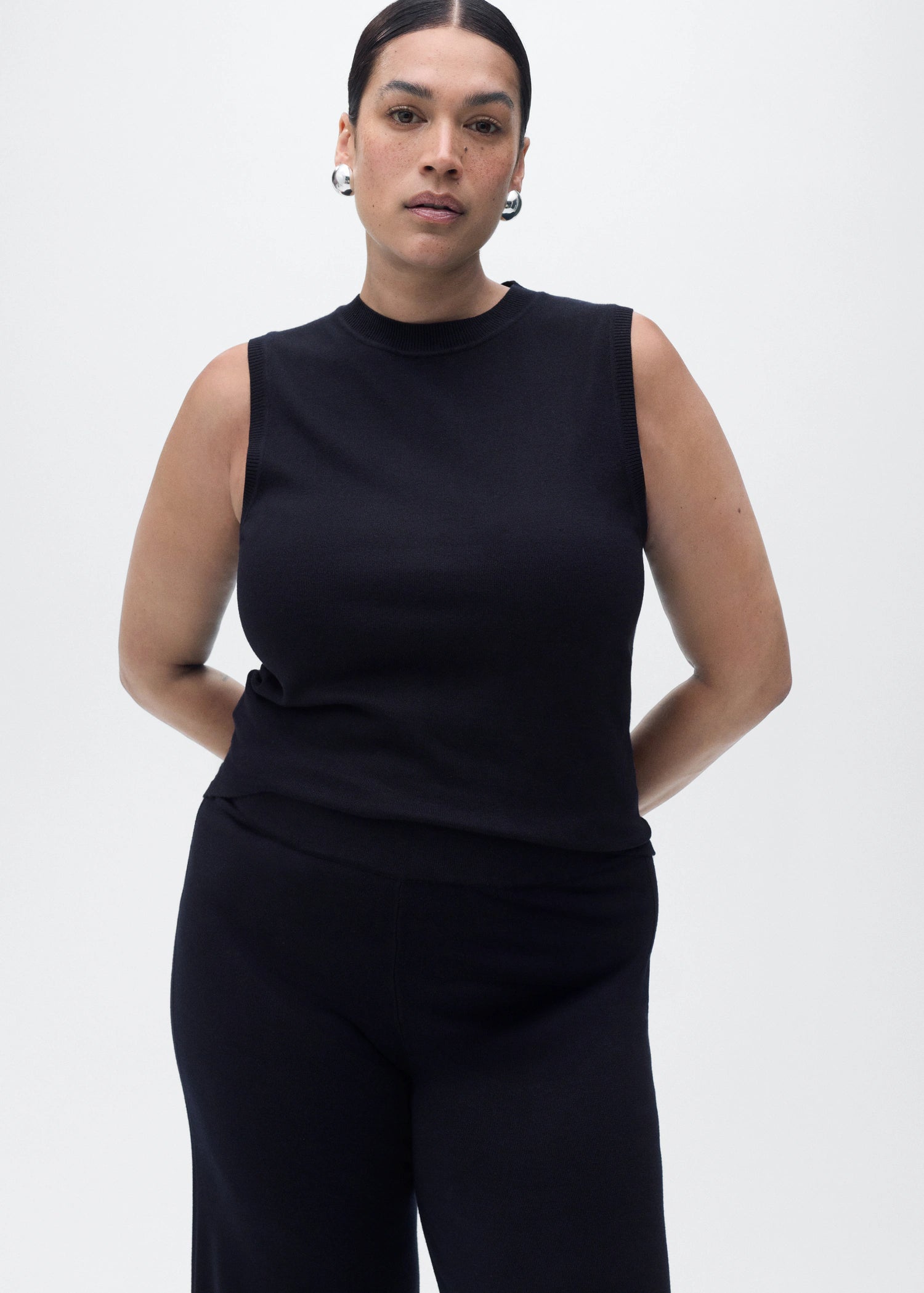 Fine-knit fabric. Long design. Wide-leg design. Mid-rise. Elasticated waistband. No fastening. Total look. Available Plus.