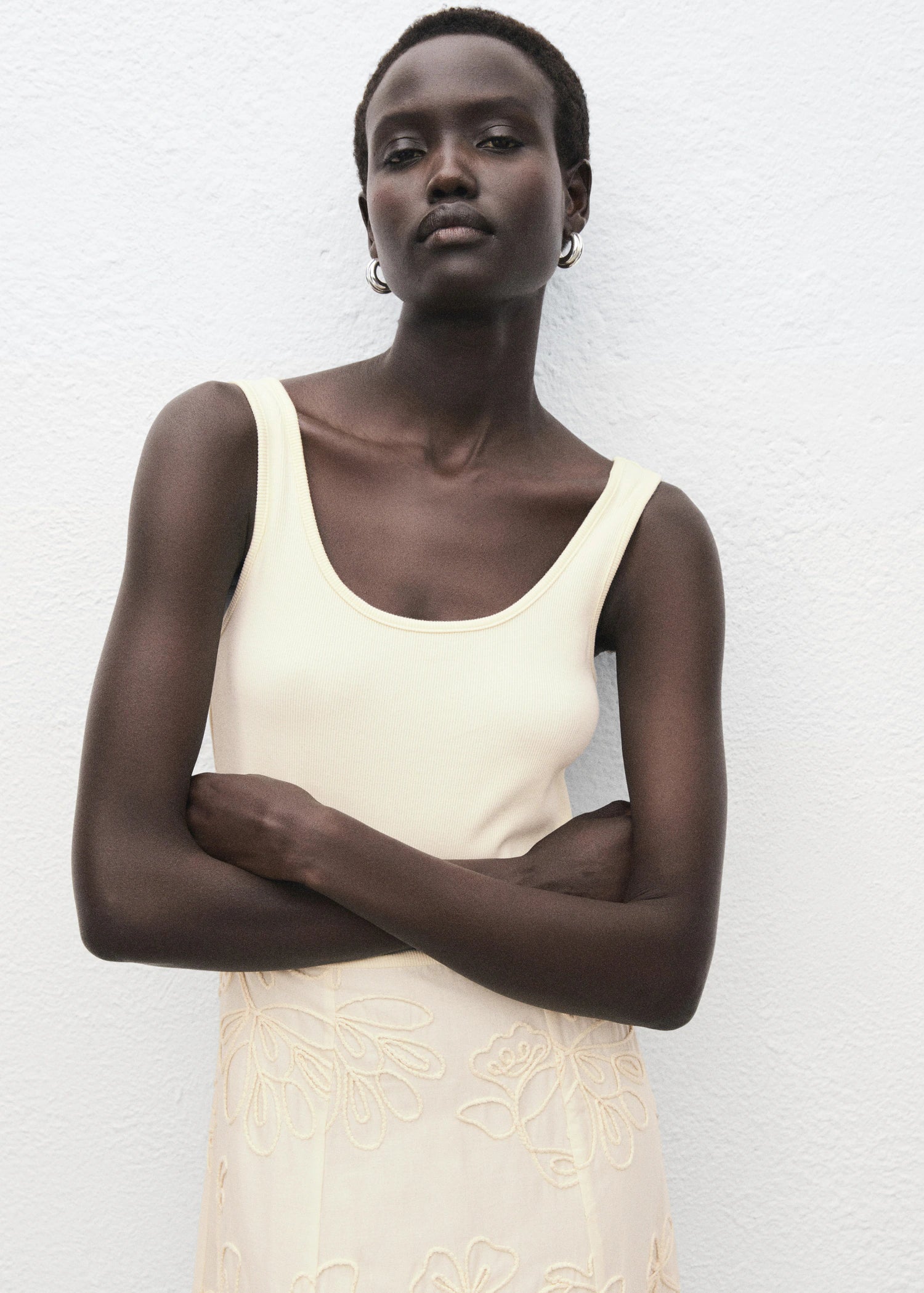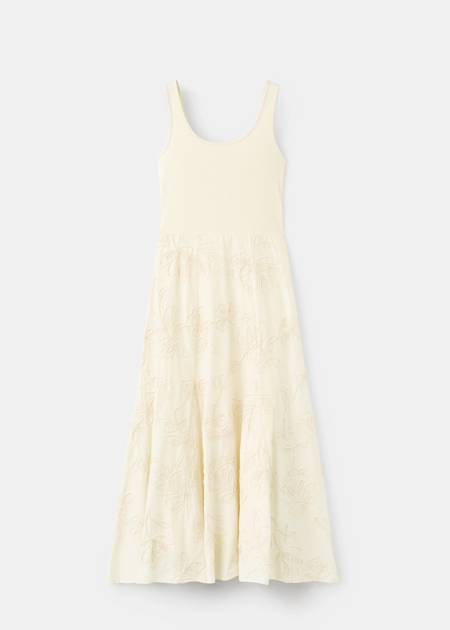Cotton fabric. Long design. Combined design. A-line design. Flowered embroidery. Low neckline. Sleeveless. Wide straps. Side zip closure. Inner lining. This garment is part of our casual collection, designed to stylishly accompany you in your day-to-day life.