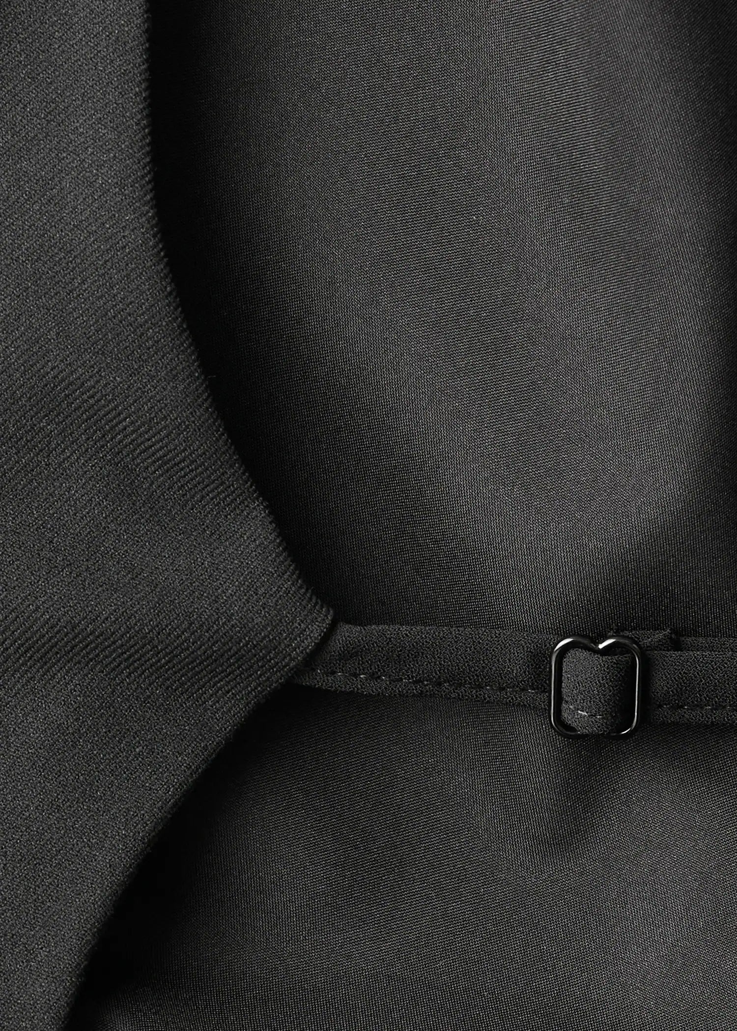 Short design. Fitted design. Halter neck. Open back. Side ruffles. Adjustable strap at the back. Button fastening at the neck. Inner lining.