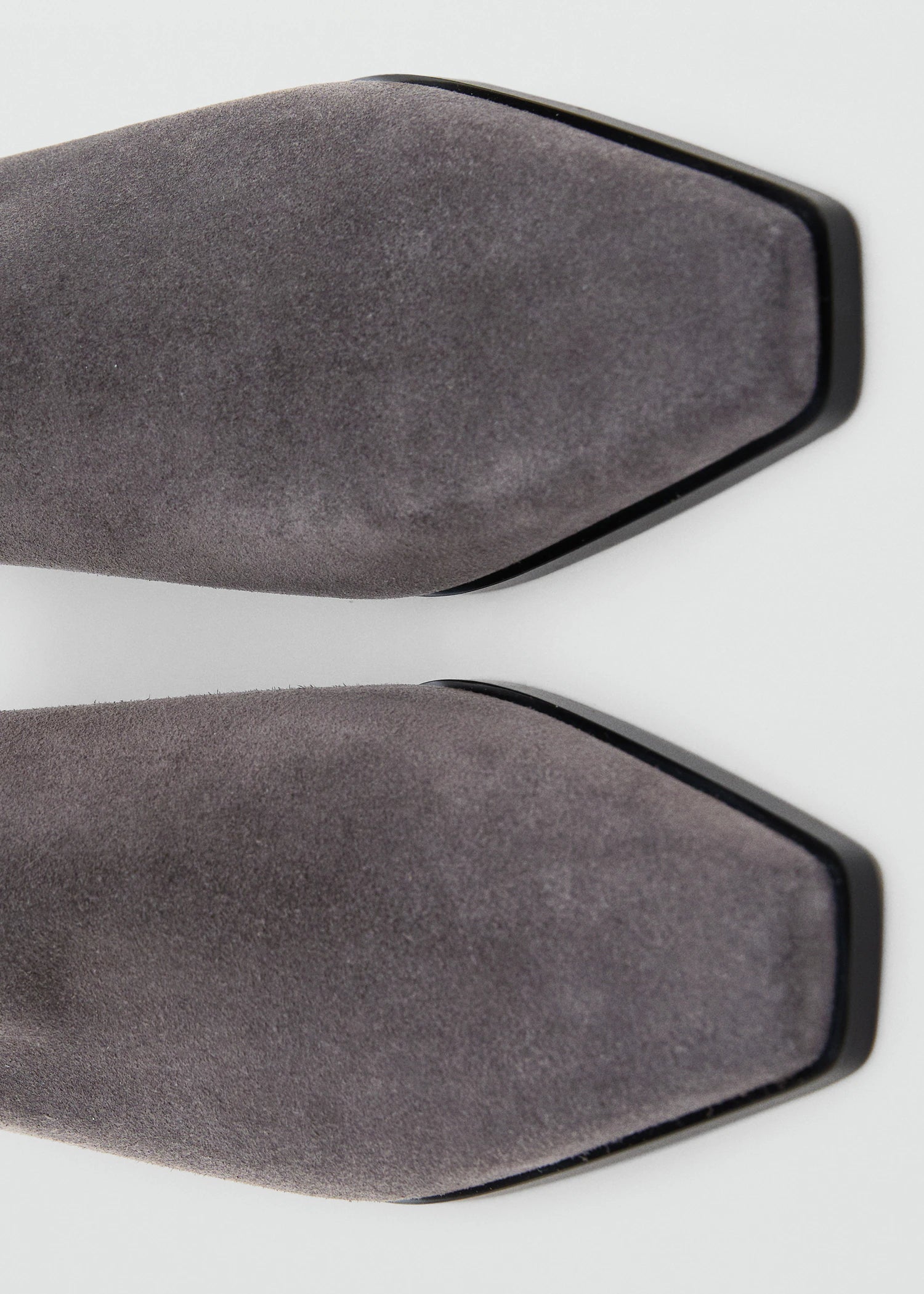 Suede. Pointed. Elastic panel. Rectangular heel. 4.5 cm heel. No Fastening. The grey colour is exclusive online.