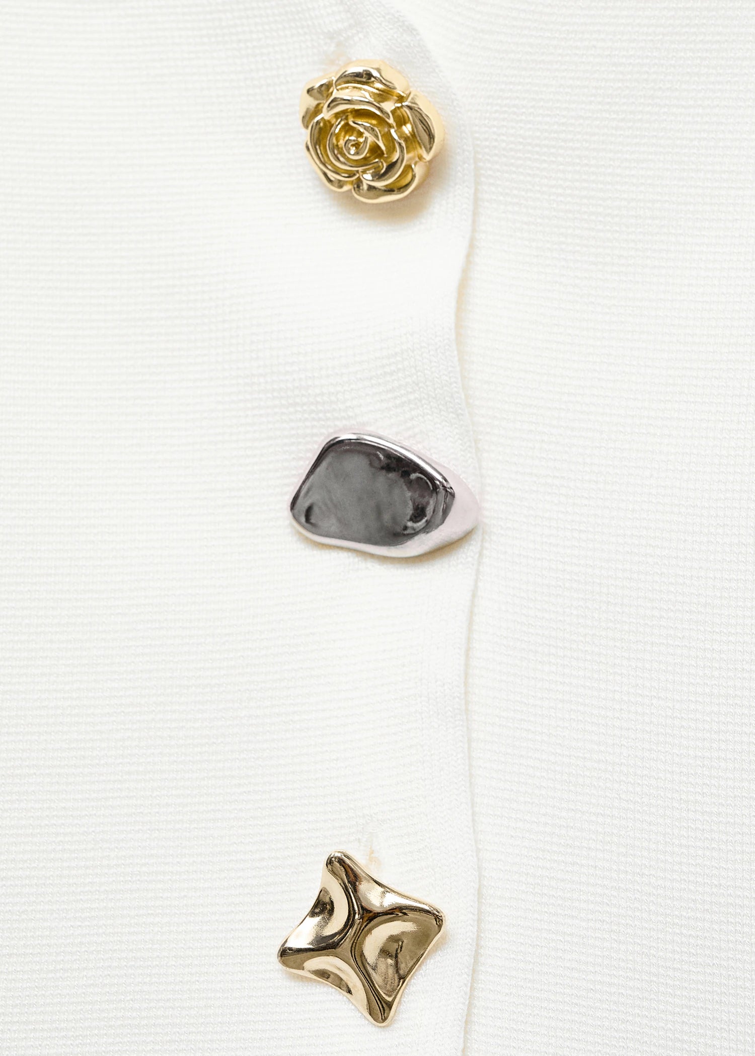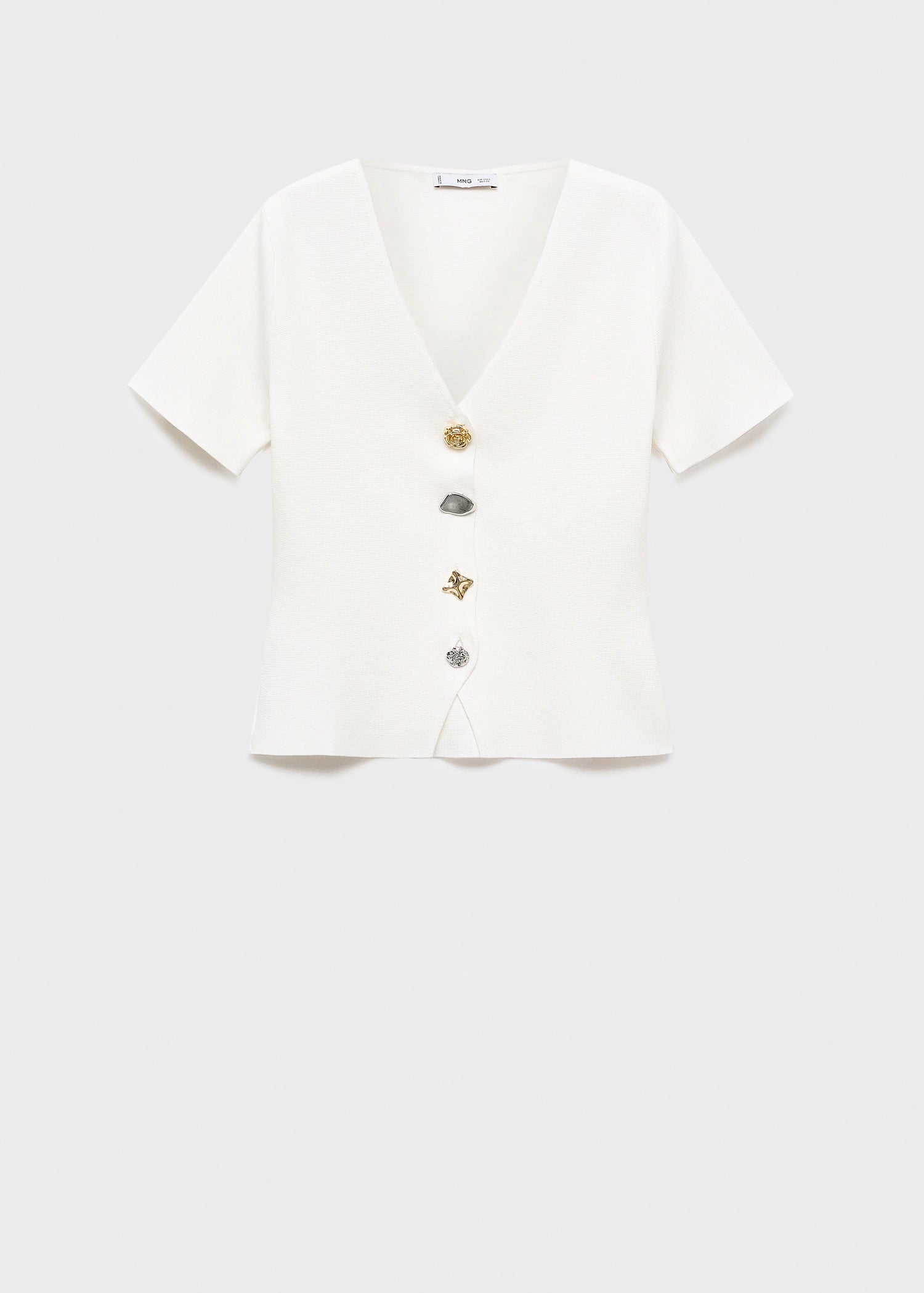 Crafted from a fine-knit fabric, this fitted design features an elegant V-neck and short sleeves. Jewel-effect buttons adorn the front fastening, giving it a distinctive air