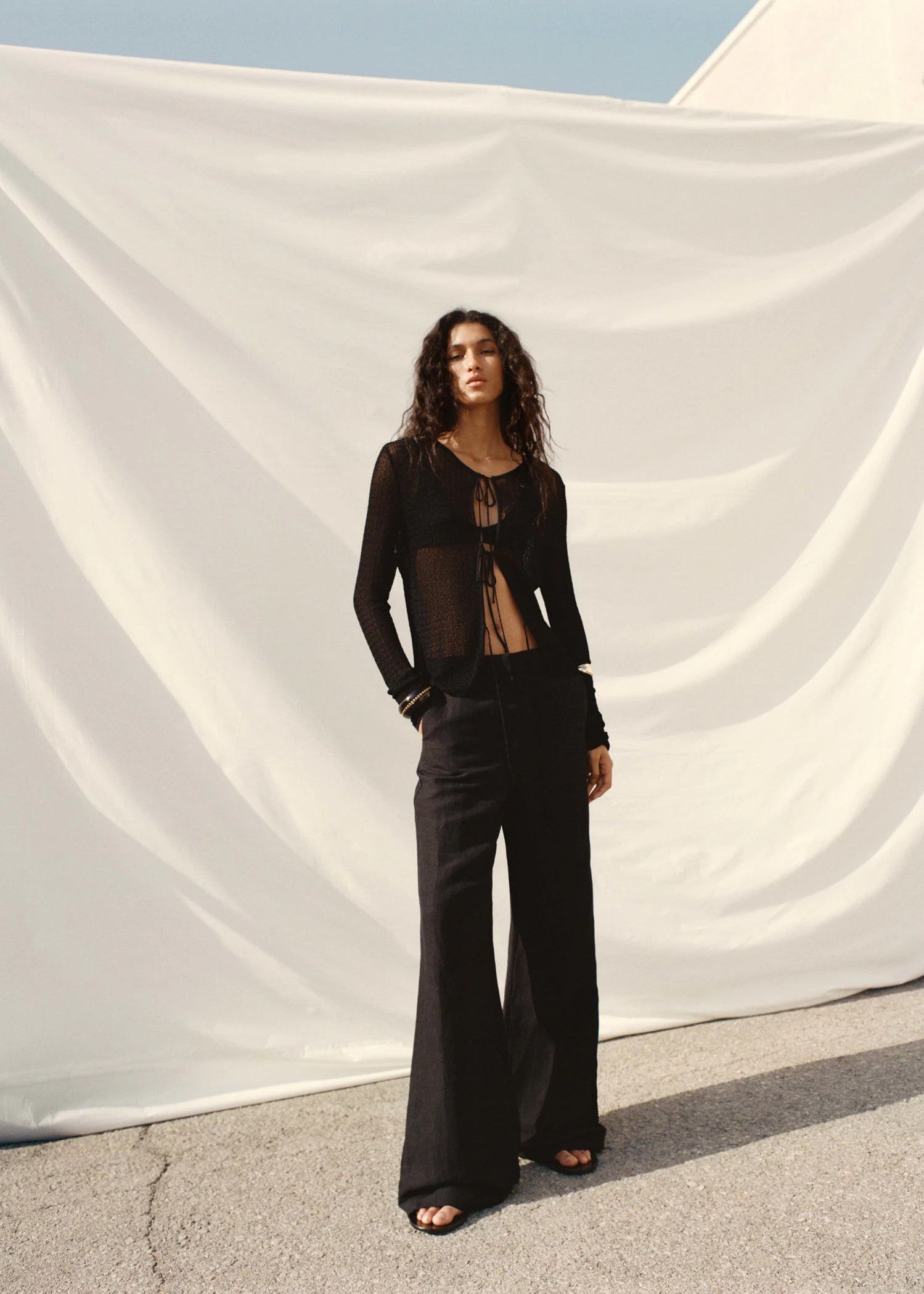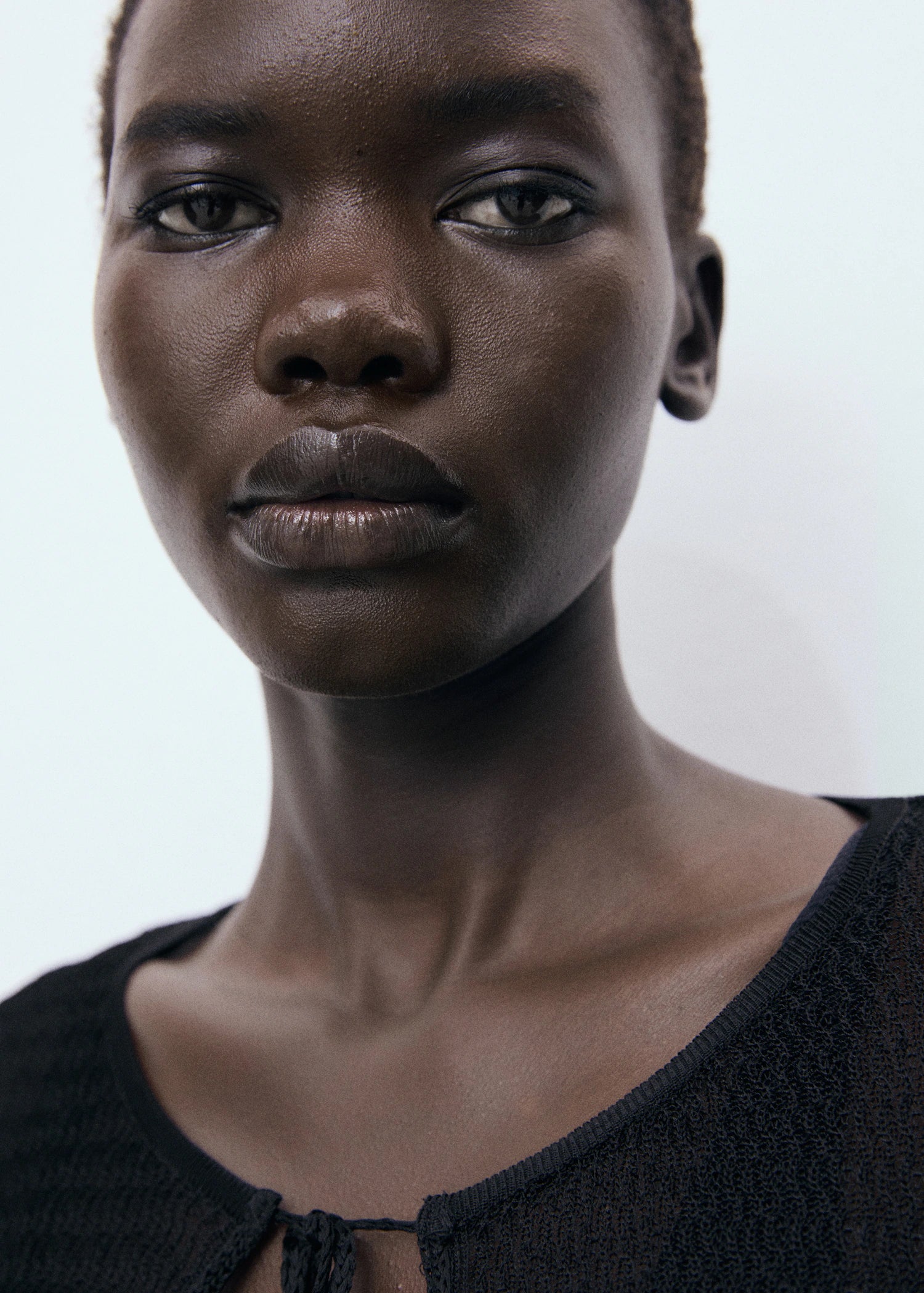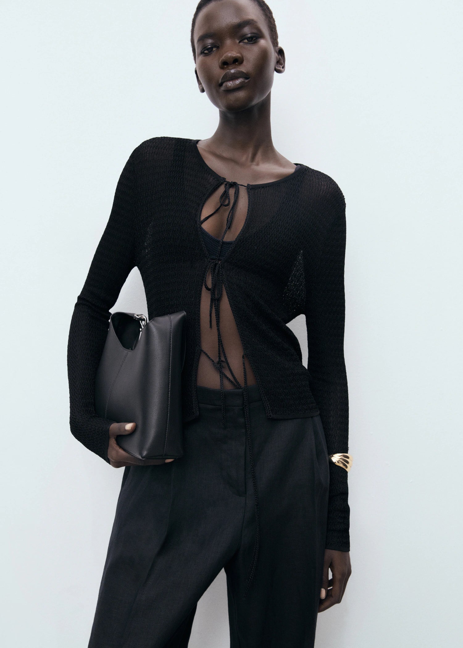 Semi-transparent design. Medium knit fabric. Straight Design. Crew neck. Long sleeves. Bow closure on the front.