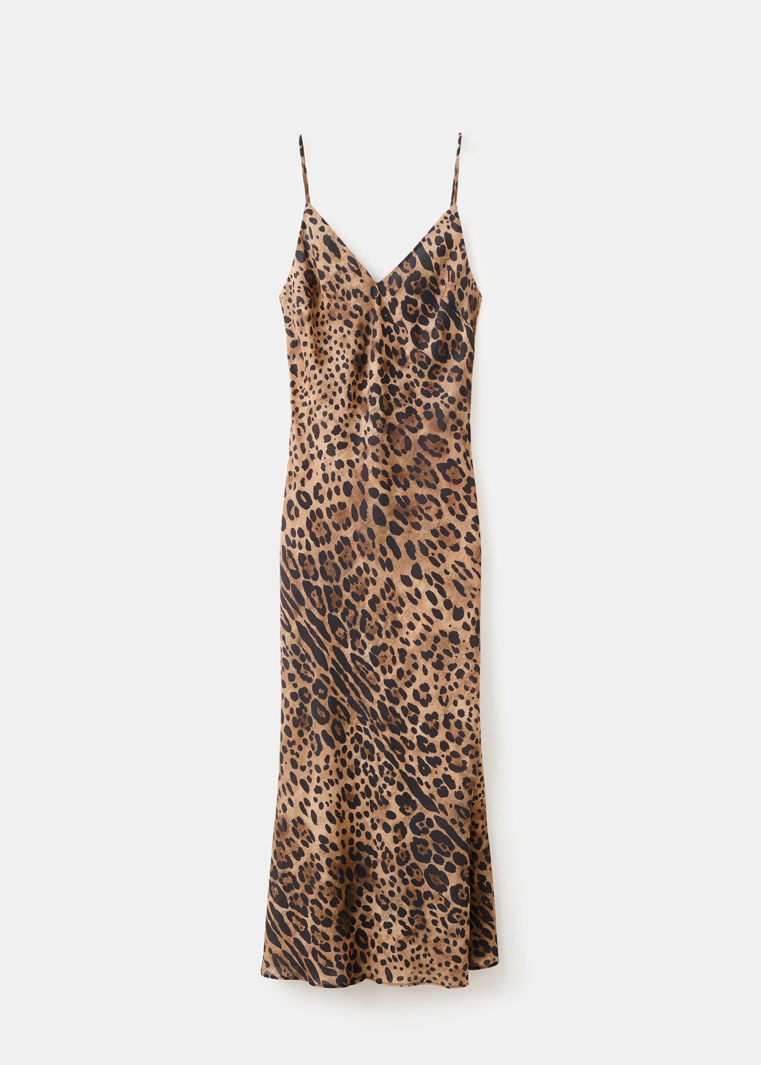 Long design. A-line design. Leopard print. Low neckline. Sleeveless. Wide straps. Open back. Zip closure.