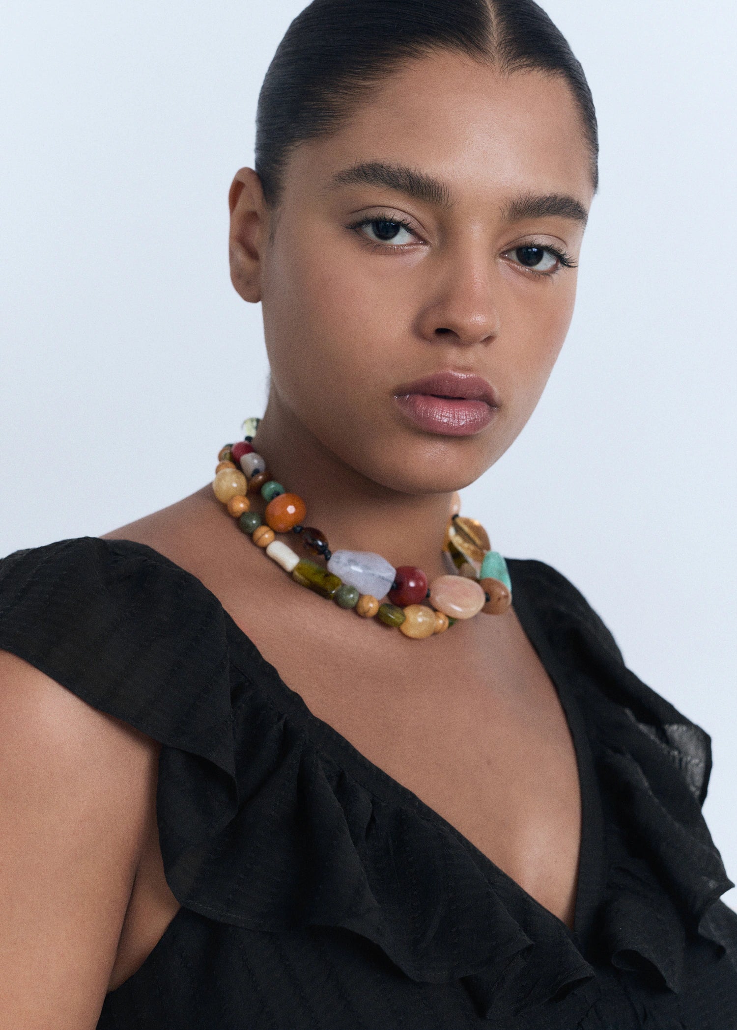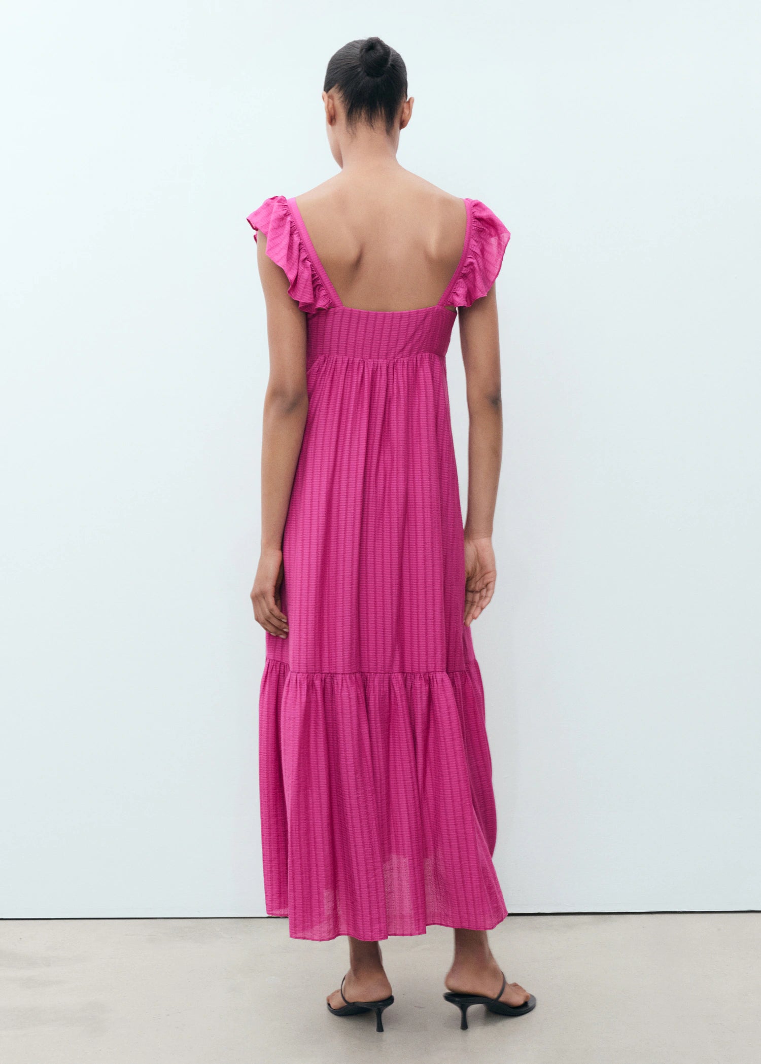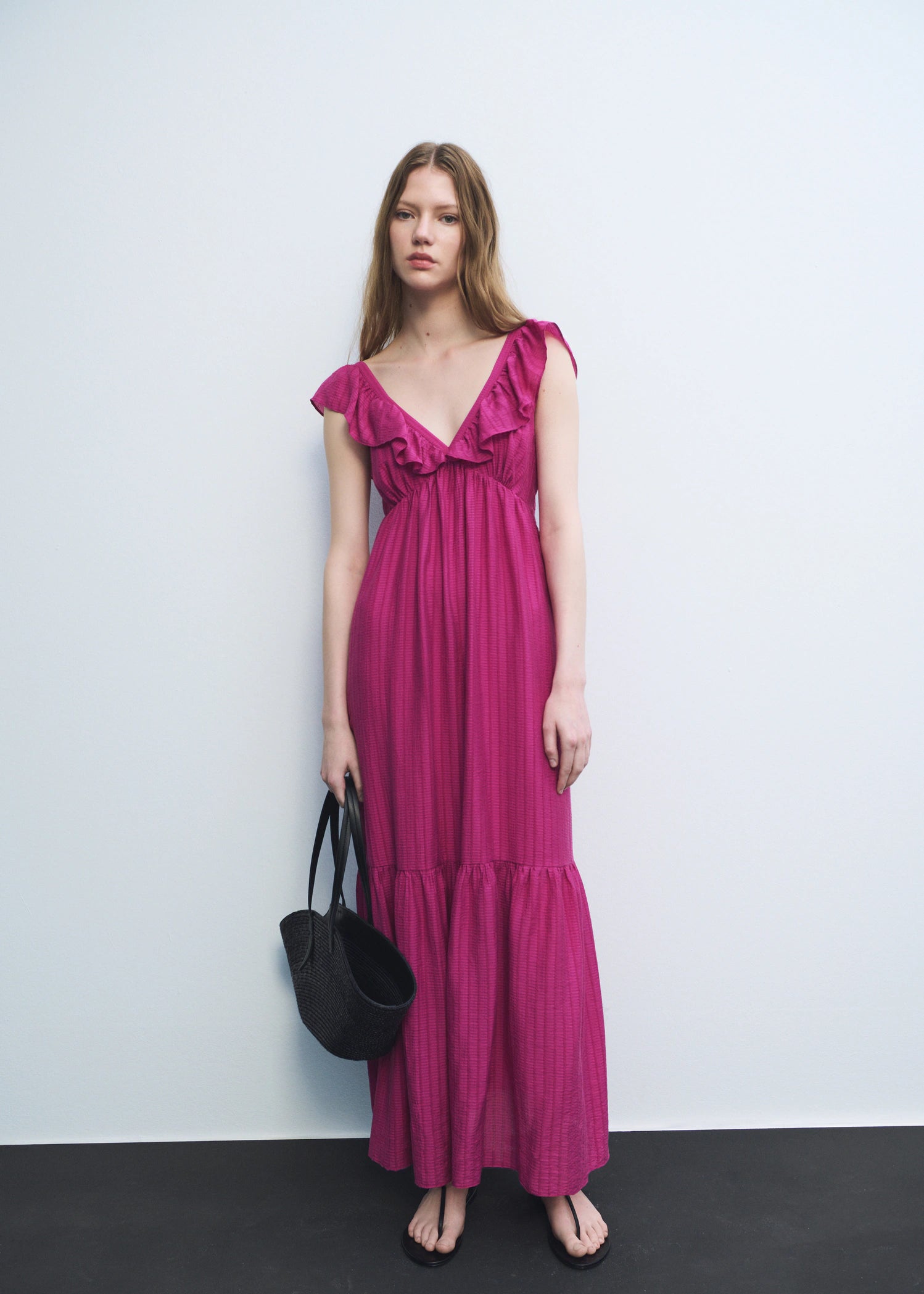 Long design. A-line design. V-neckline. Ruffles detail on the neck. Sleeveless. Wide straps. Side zip closure. Inner lining. The fuchsia colour is an online exclusive. This garment is part of our casual collection, designed to stylishly accompany you in your day-to-day life.