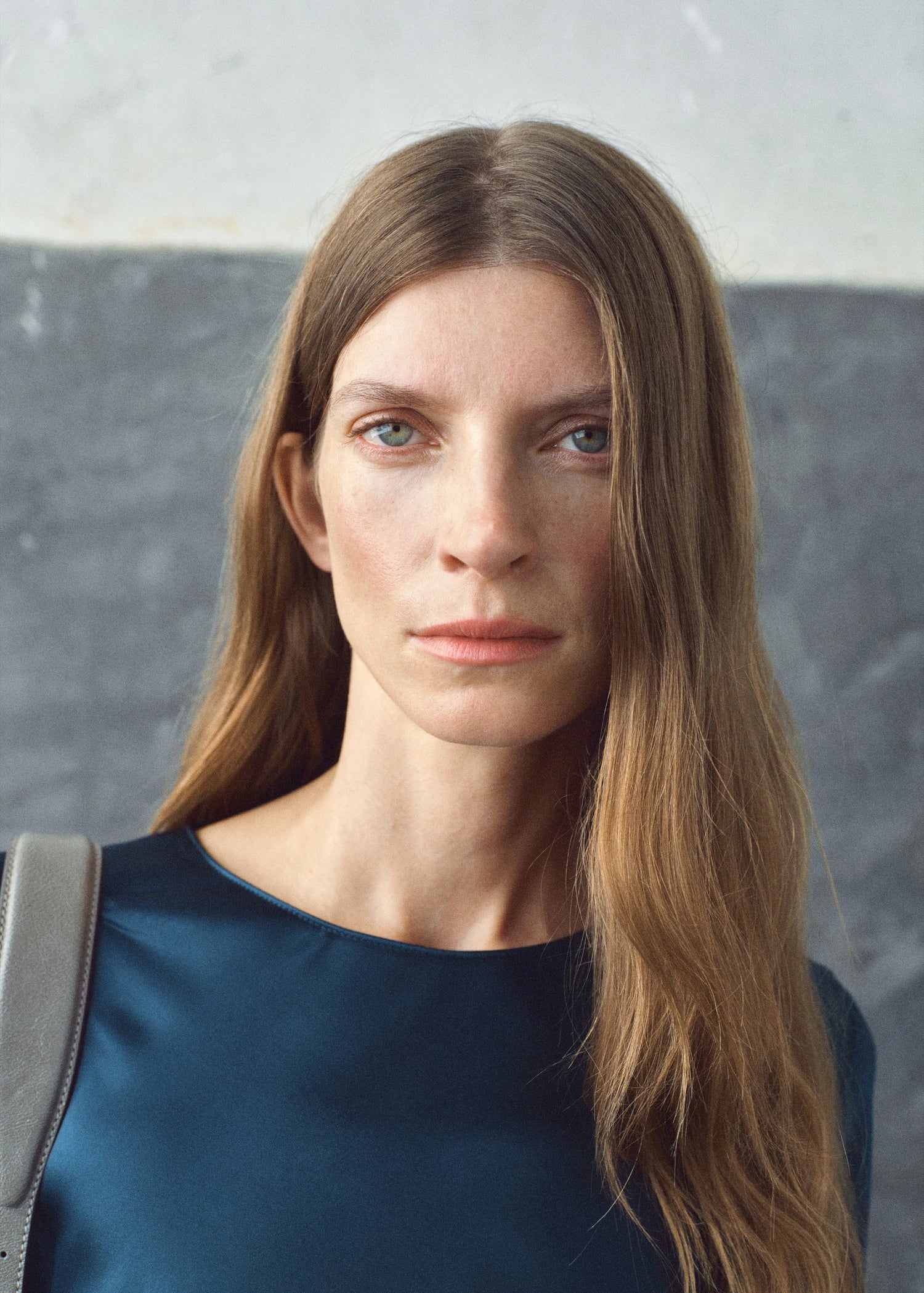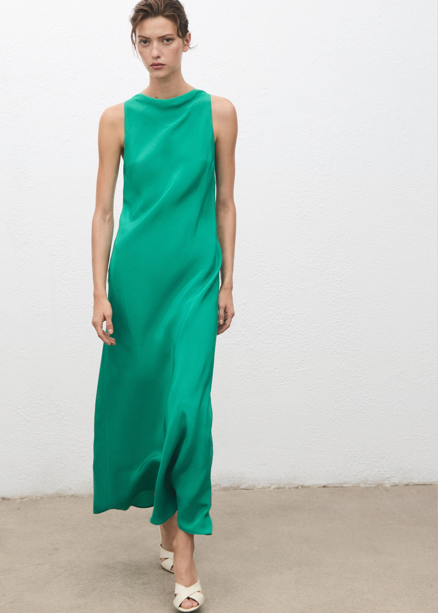 Satin fabric. Long design. Fitted design. Round neck. Long sleeves. Back-slit hem. Button closing on the neck.