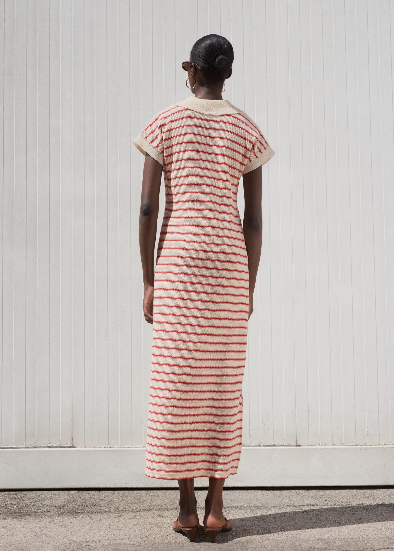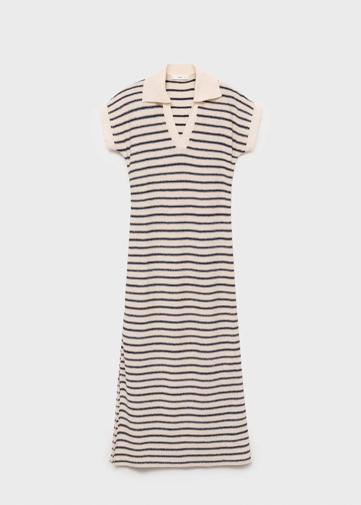 Fine-knit fabric. Long design. Straight Design. Woven stripe. Shirt-style V-neck collar. Short sleeves. No fastening. This garment is part of our casual collection, designed to stylishly accompany you in your day-to-day life.