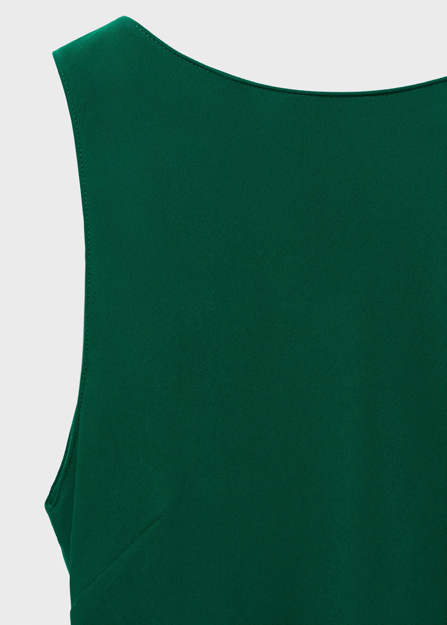 Midi design. A-line design. Round neck. Sleeveless. Wide straps. Draped back. Open back with tie. No Fastening.