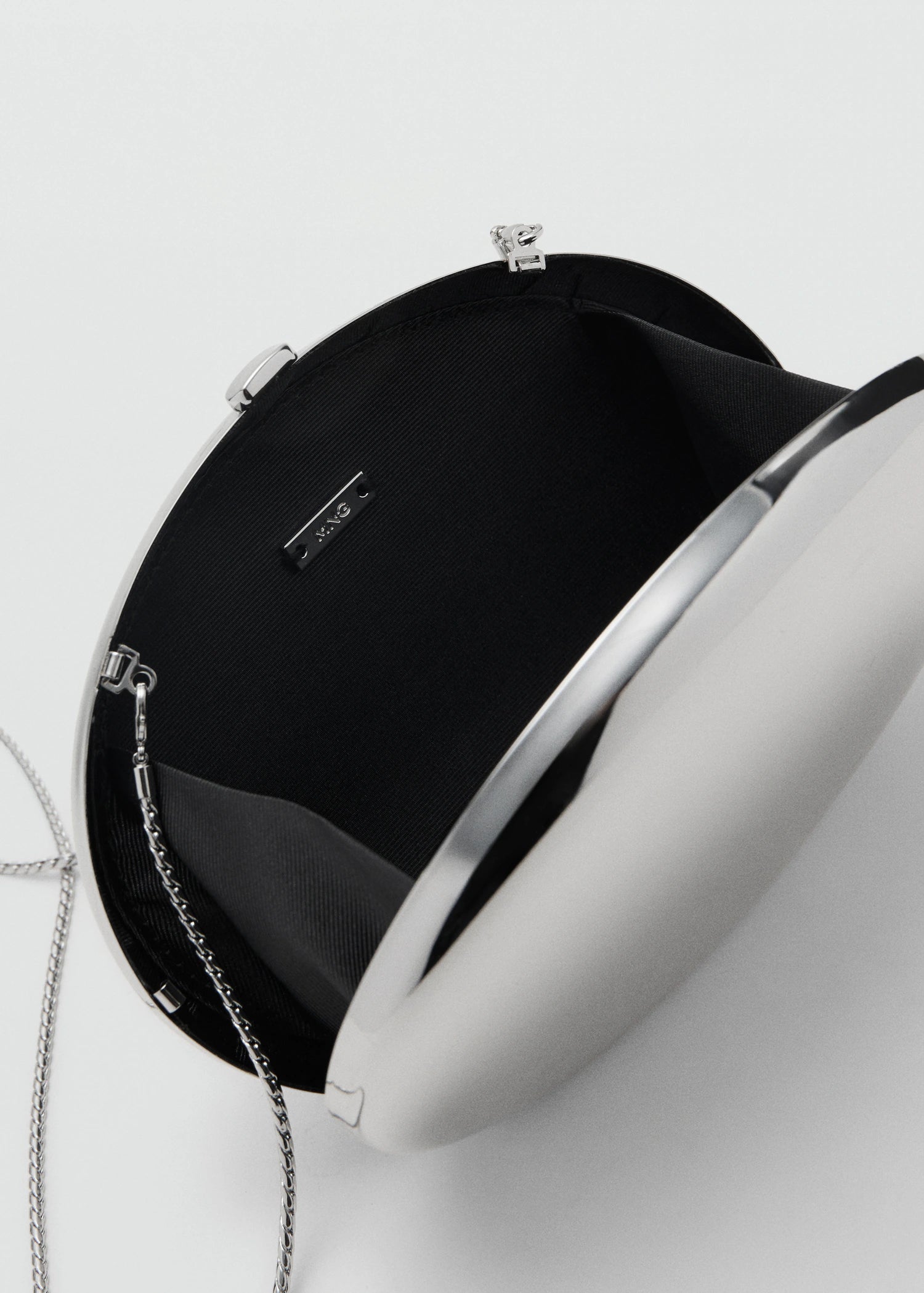 Metallic design. Oval design. Clutch style. Long detachable chain strap. Metal snap closure. Inner lining.