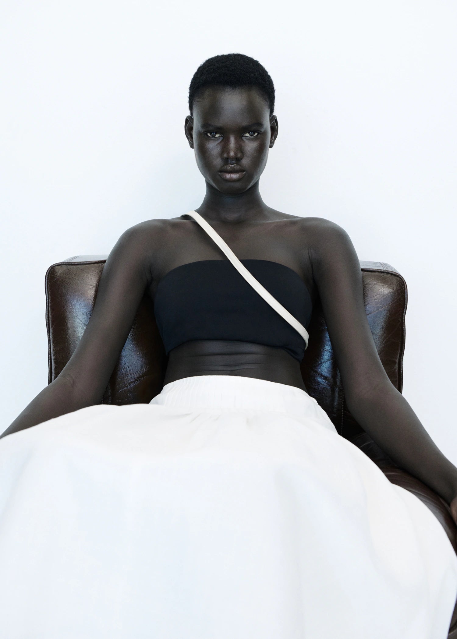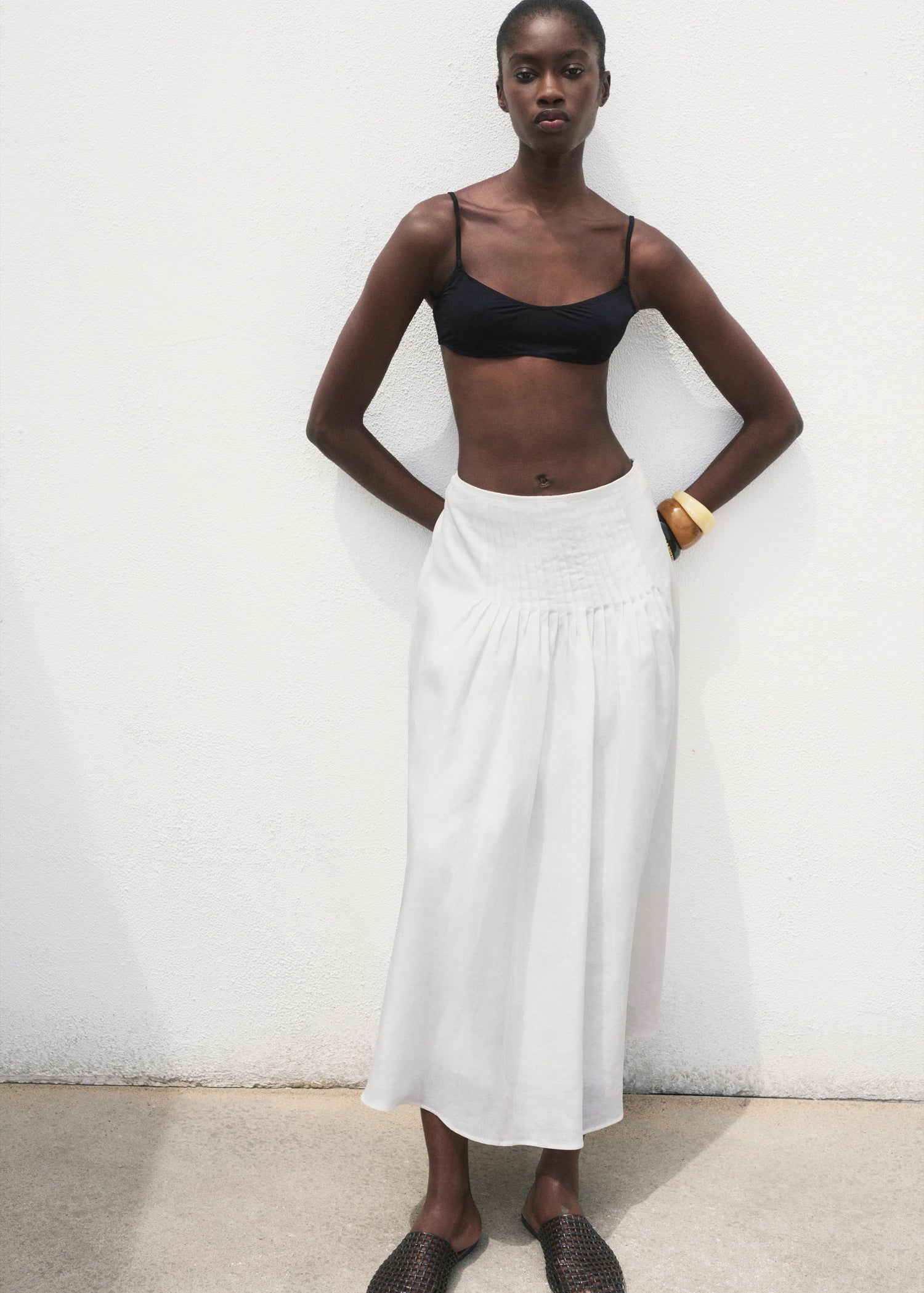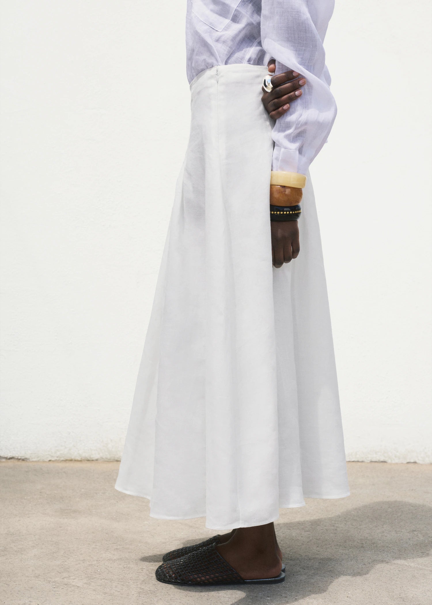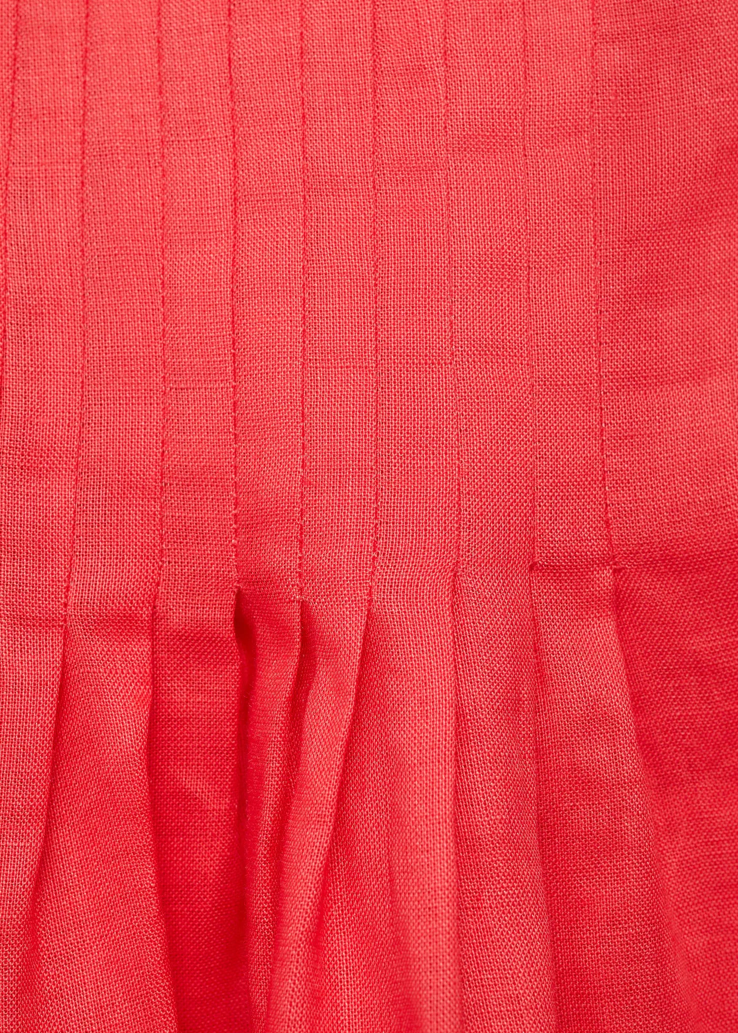100% ramie fabric. Long design. A-line design. Pleated panel at the waist. Side zip closure. 100% cotton lining. Promotional product.