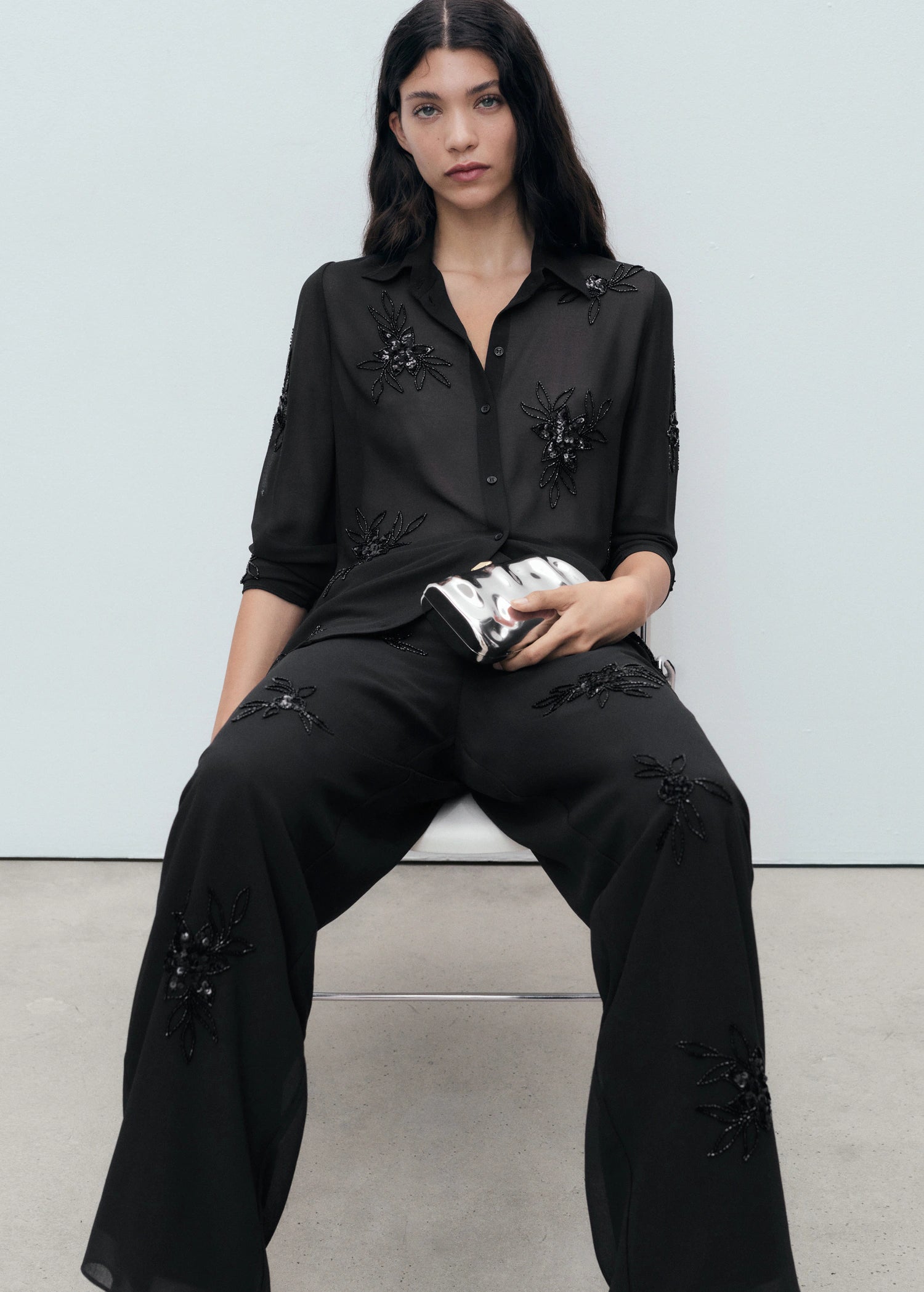 This long, straight trouser combines elegance and sophistication with exquisite floral bead embroidery that captures the light. Crafted from lightweight fabric, its adjustable waistband with elastic ensures comfort, while the straight fit style offers a classic and timeless silhouette.