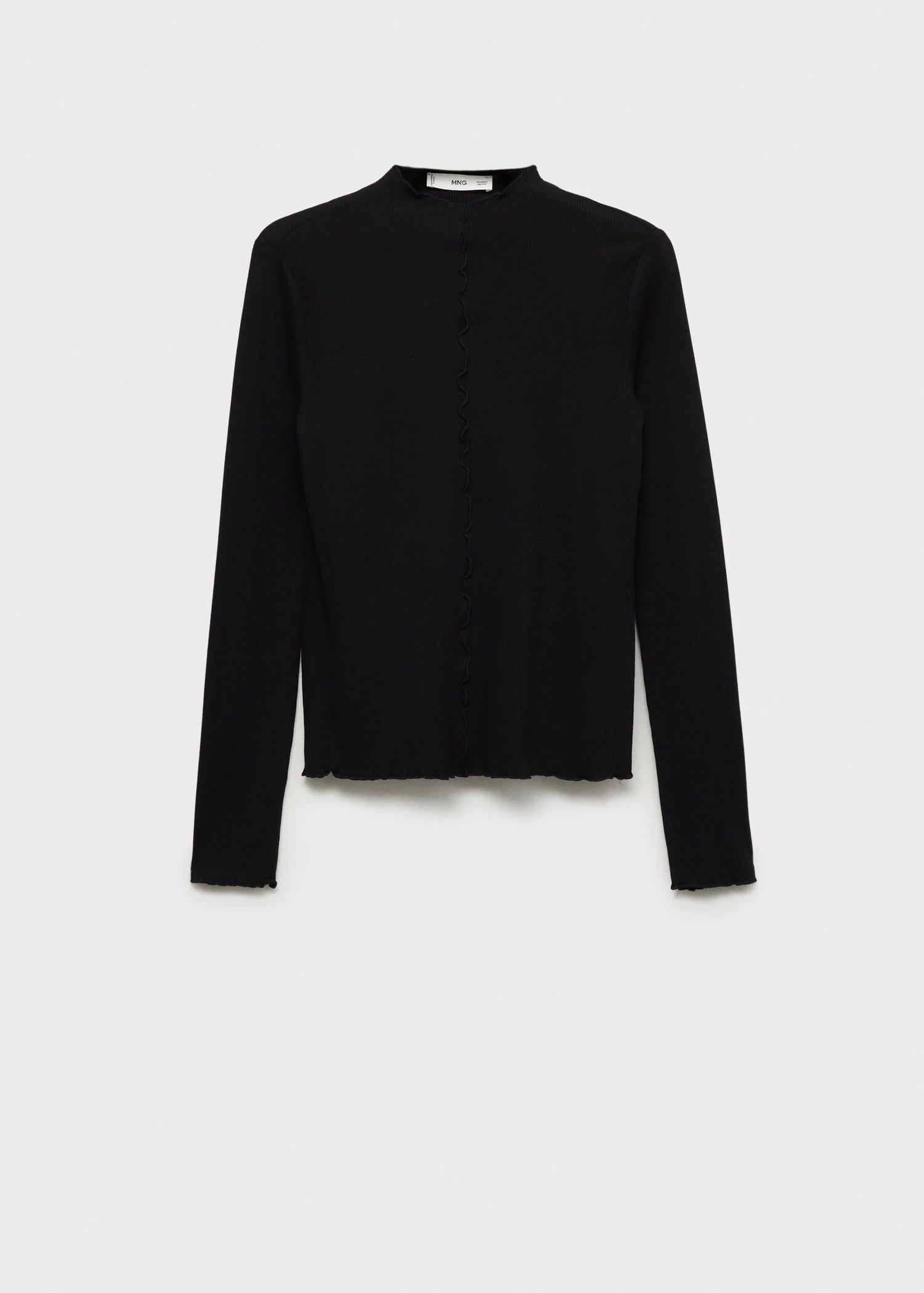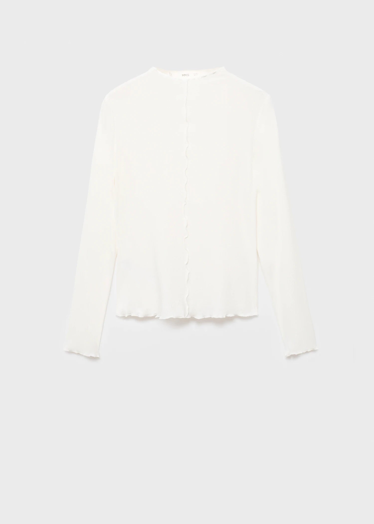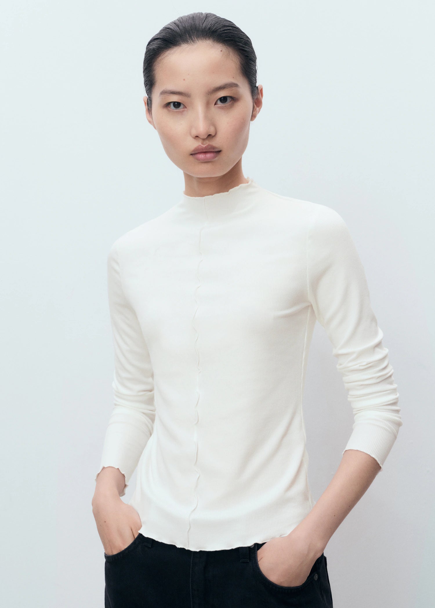 Crafted from ribbed fabric, this garment features a fitted design with a Perkins collar and long sleeves. It includes seam detailing and scalloped edges.