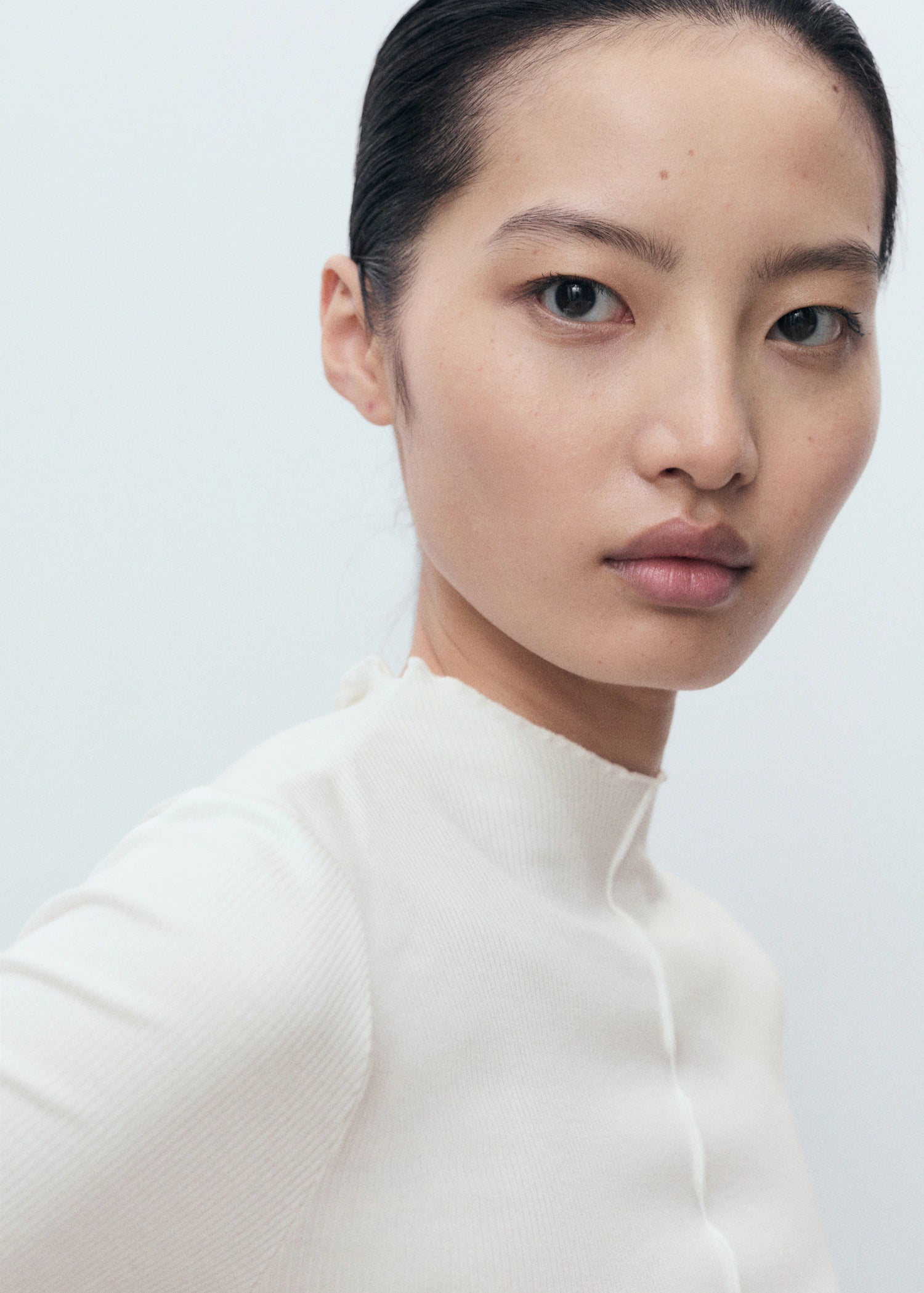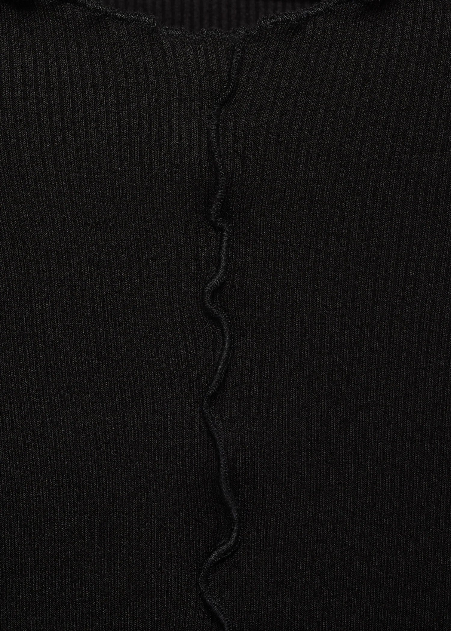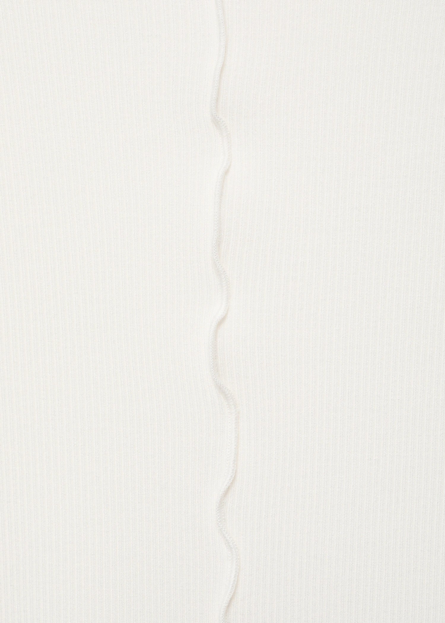 Crafted from ribbed fabric, this garment features a fitted design with a Perkins collar and long sleeves. It includes seam detailing and scalloped edges.