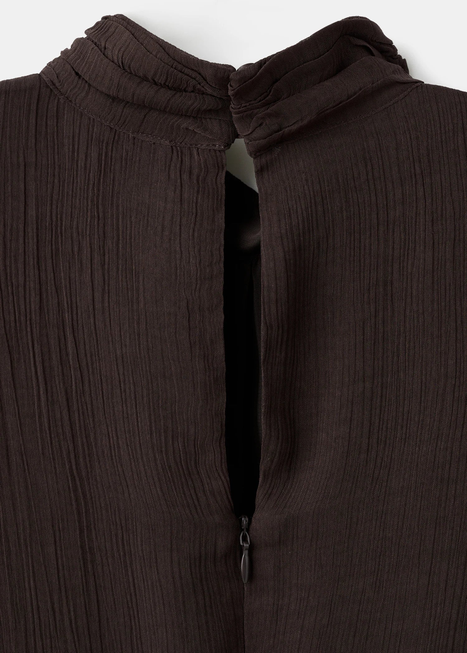 Gauze fabric. Straight Design. Midi design. Stand-up collar. Long puffed sleeves. Gathered panel at the waist. Zipper and button closure at the back. Inner lining.