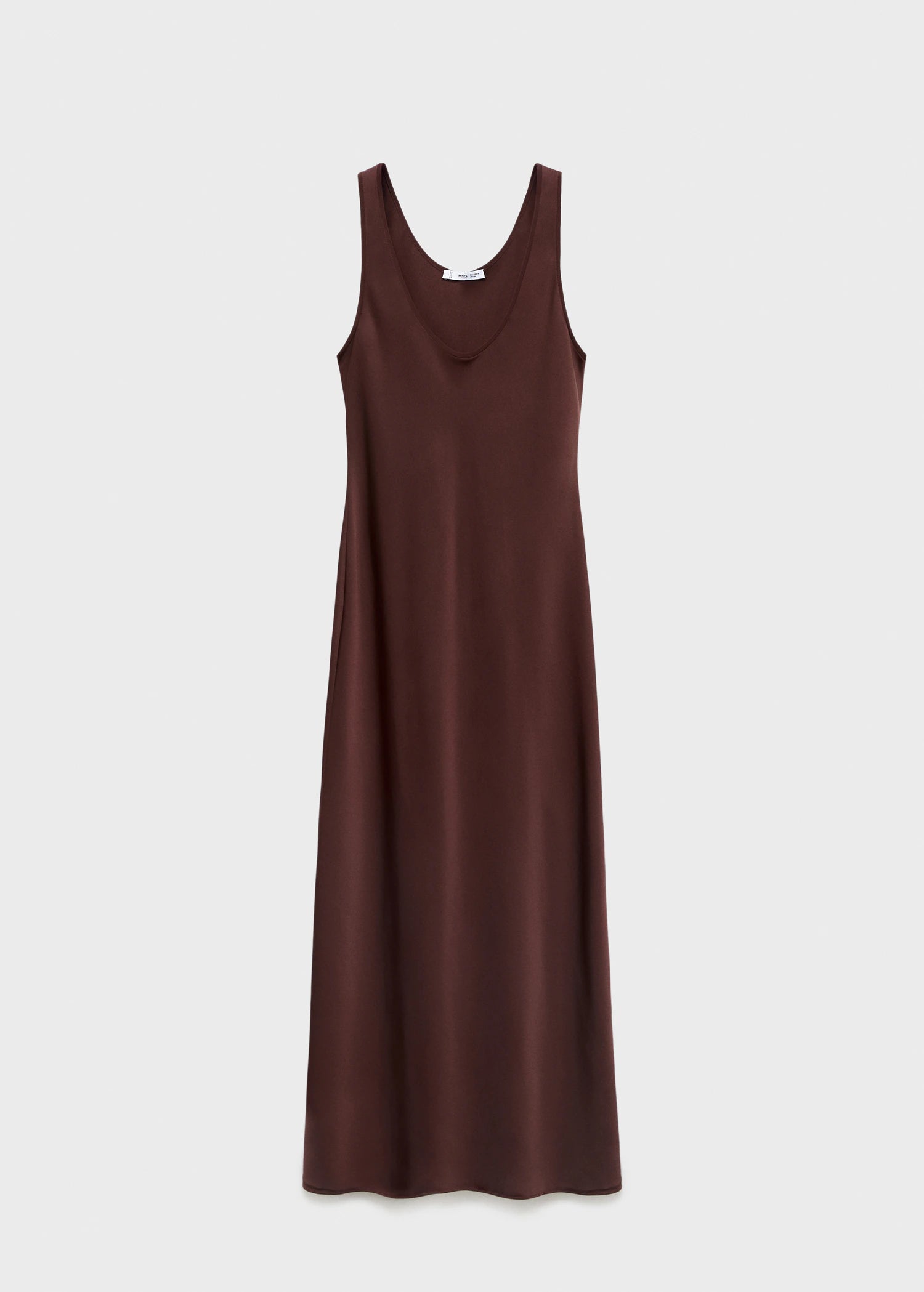 Satin fabric. Long design. Straight Design. Round scoop neckline. Sleeveless. Wide straps. No Fastening.
