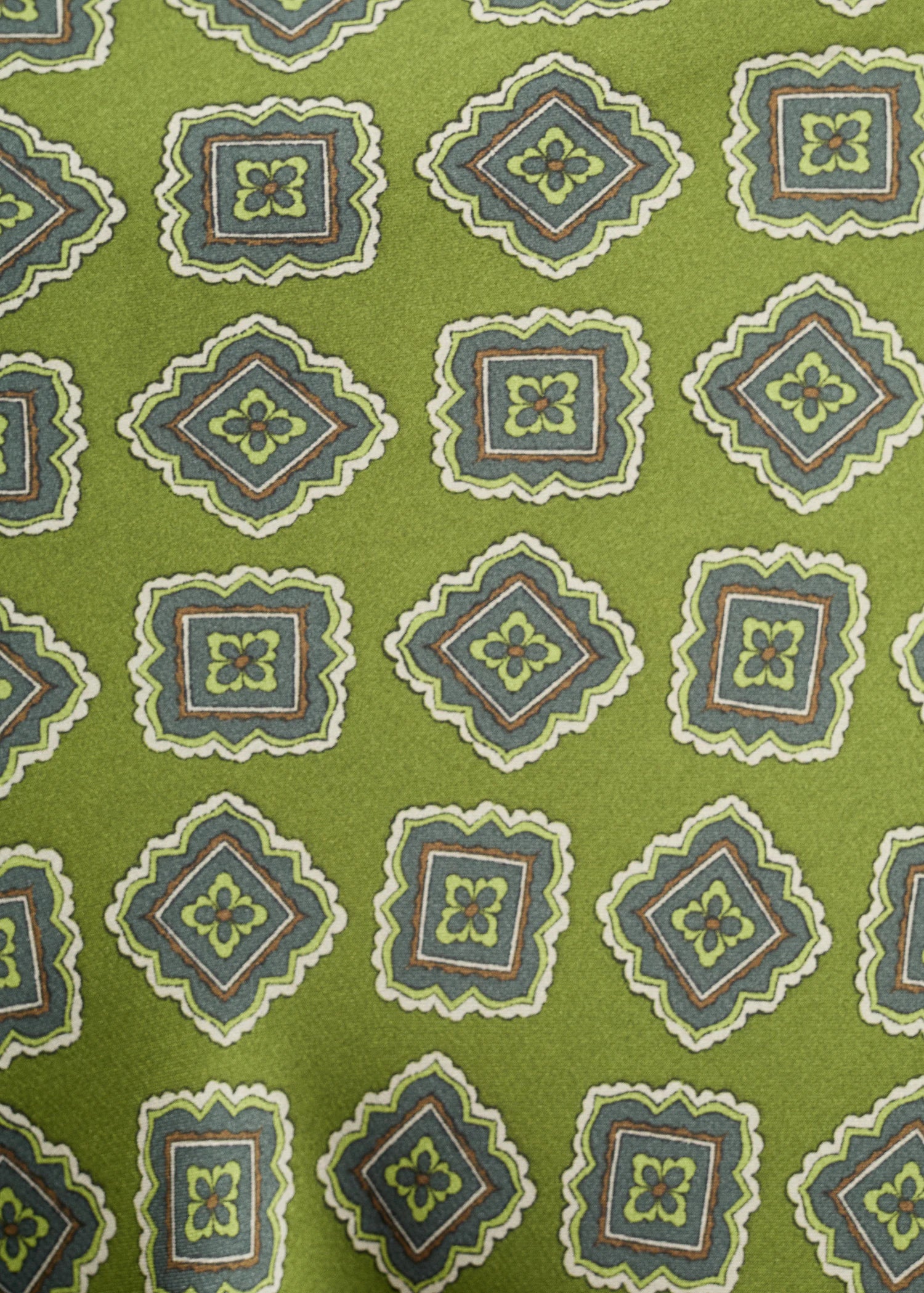 Satin fabric. Short design. Straight Design. Geometric print. High collar. Long sleeves. Zip fastening on the back section.