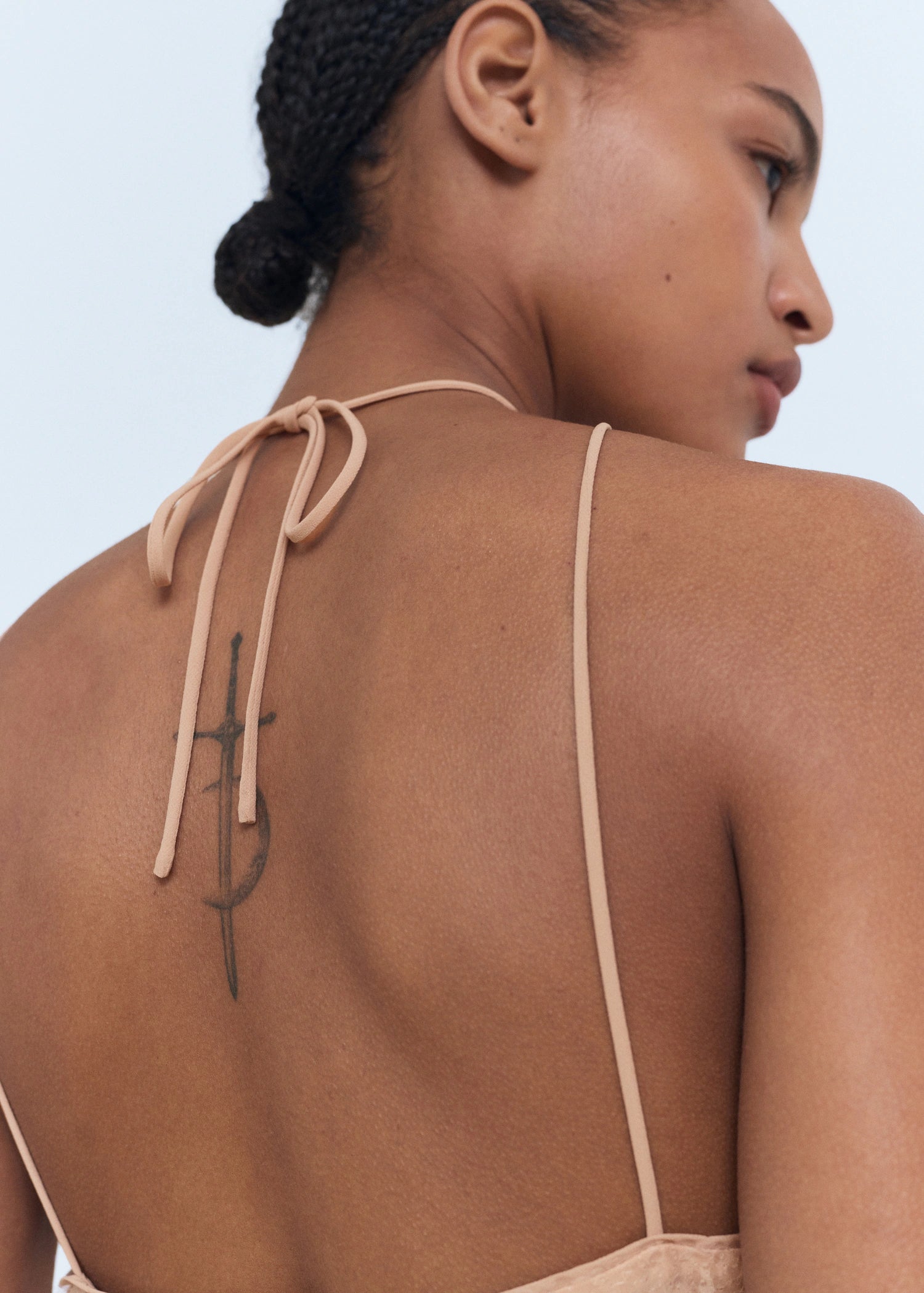 Sequin fabric. Midi design. Straight Design. Halter neck. Sleeveless. Thin straps. Back neckline. Bow fastening on the neck. Inner lining.