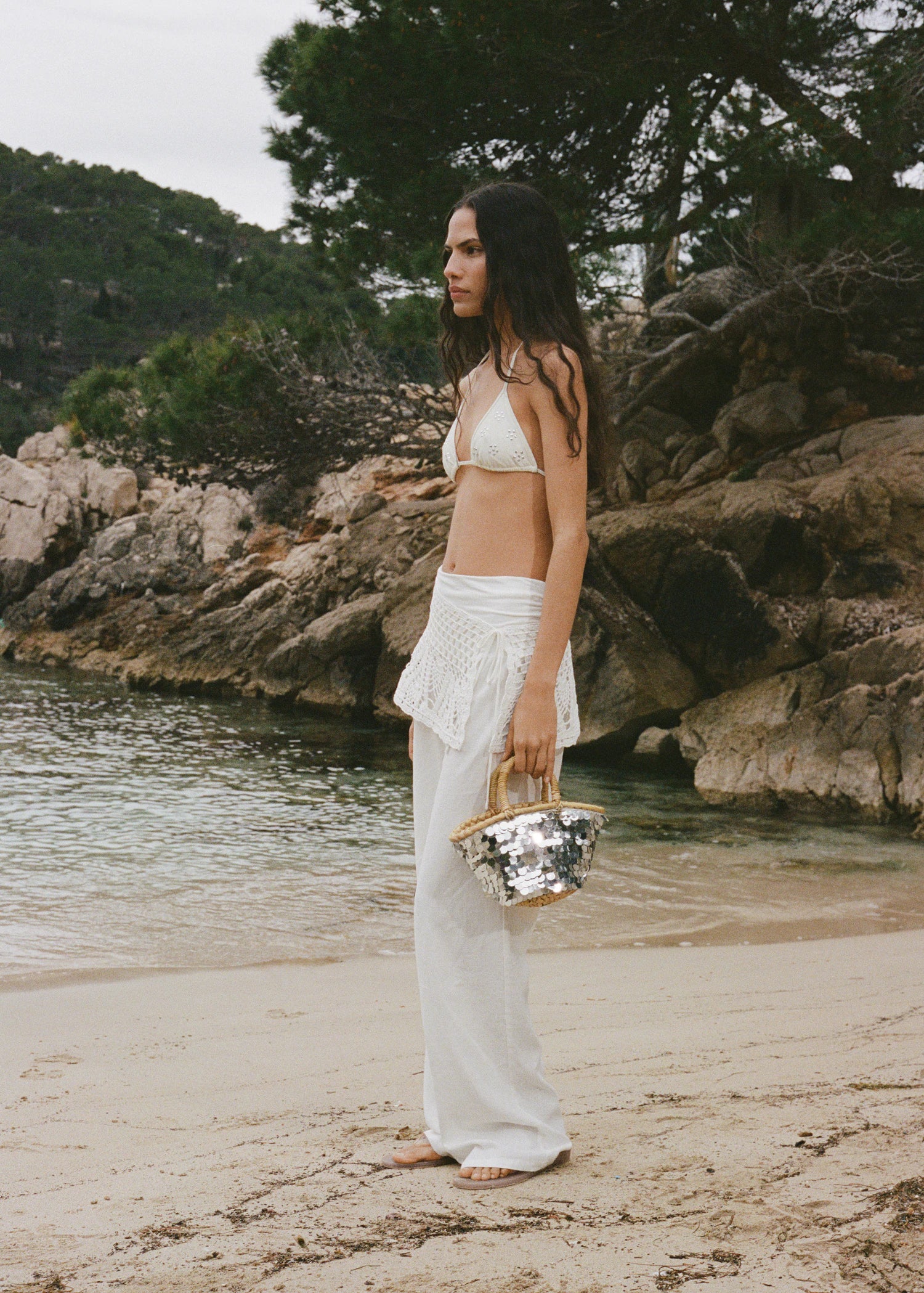 Small size. Natural fibre fabric. Fabric with sequin. Two short hand grips. No fastening. Promotional product.